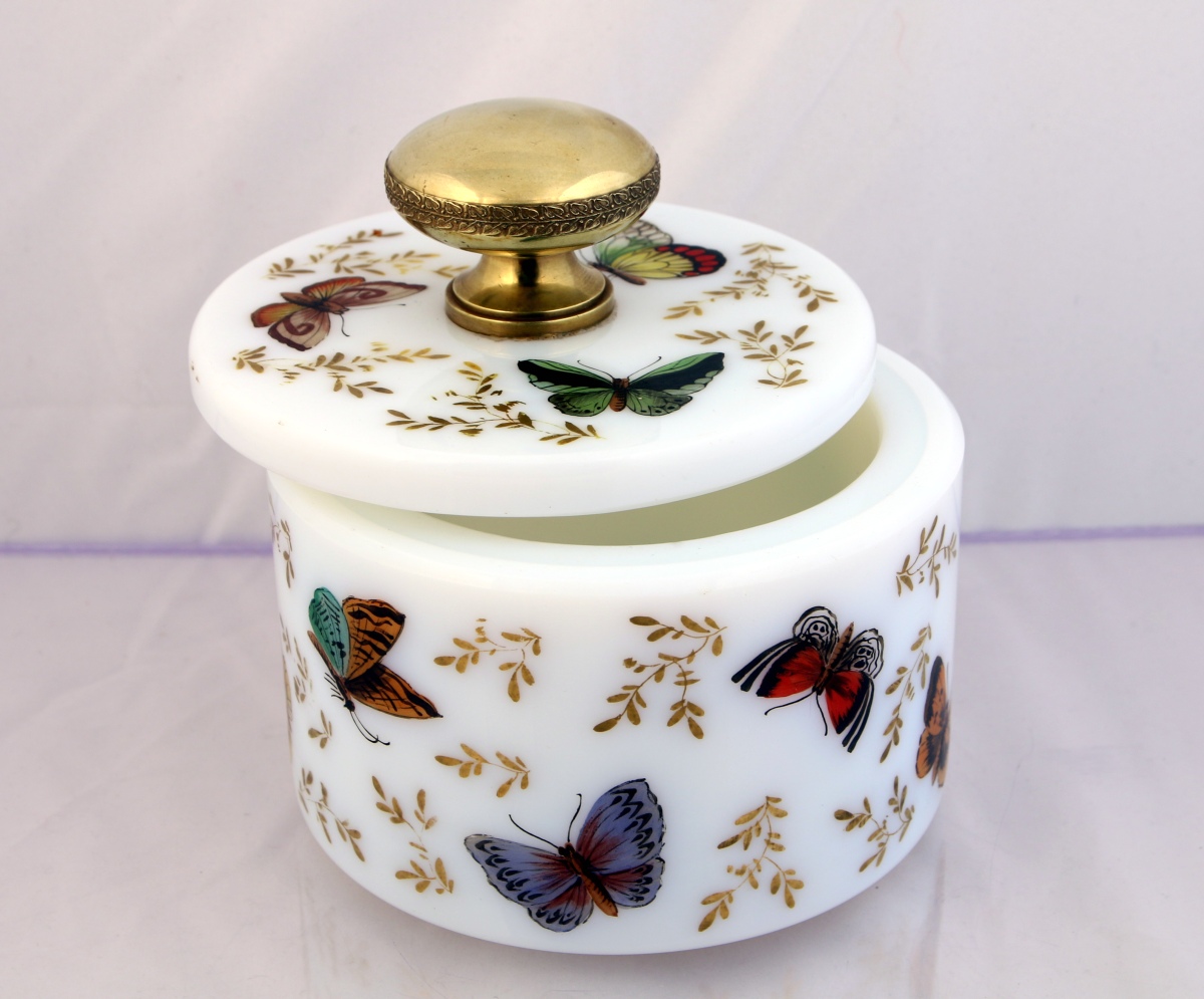 Rare et luxueux poudrier en opaline savonneuse de section cylindrique forme tambour, sa base et son couvercle décorés main d'une constellations de fleurettes dorées et de papillons multicolores, prise du couvercle en bronze doré ciselé.