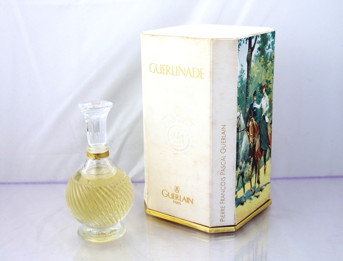 Coffret cubique en carton gainé de papier parchemin blanc avec illustrations polychromes , titré, contenant le flacon modèle "Vase Tibétain" en verre incolore pressé moulé de section cylindrique. (PdO)