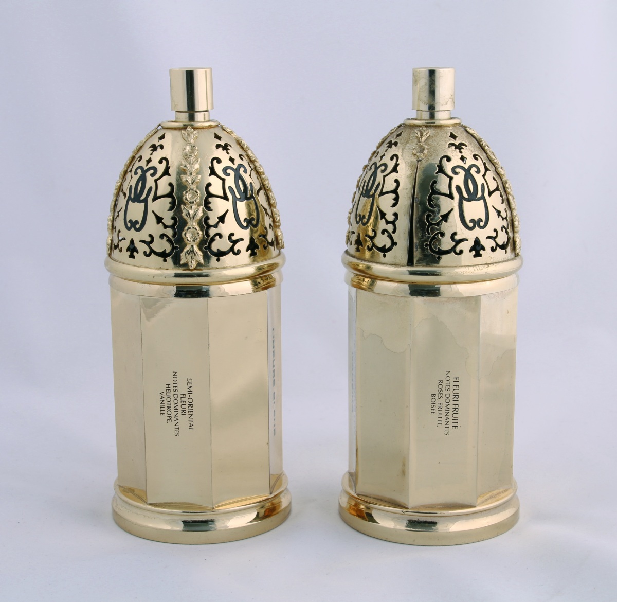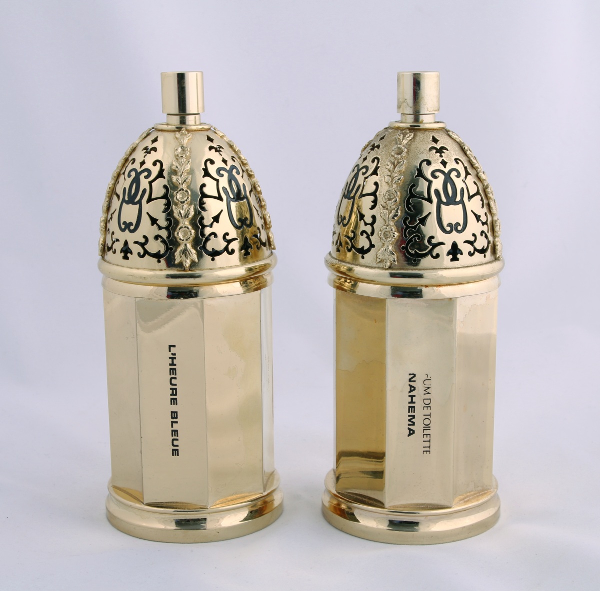 Deux flacons vaporisateurs en métal plaqué or et laiton ouvragé de section cylindrique, à décor de guirlandes de fleurs, dessinés par Robert Goossens.