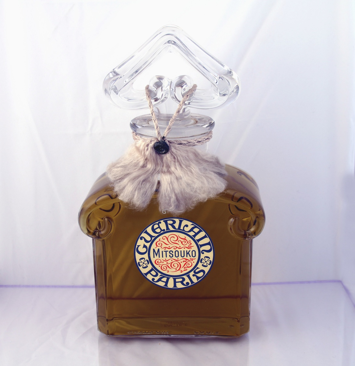 Flacon publicitaire décoratif en verre incolore pressé moulé édité par la verrerie Pochet & Du Courval , modèle "quatre volutes - bouchon coeur".