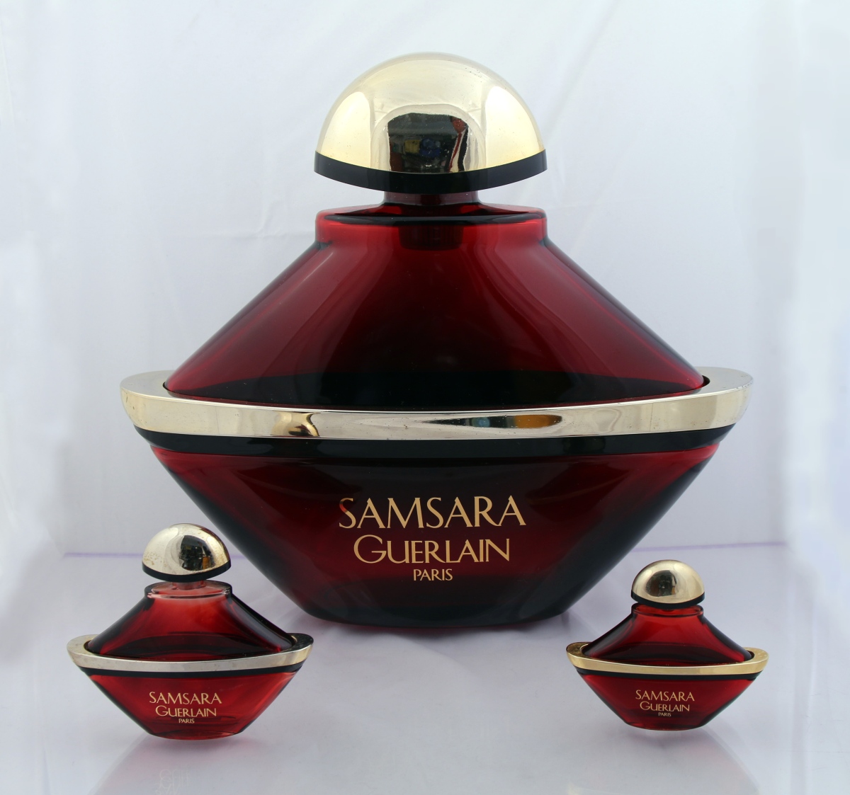 Flacon publicitaire décoratif en verre teinté rouge pressé moulé carrossé de zamac, dessiné par Robert Granai.