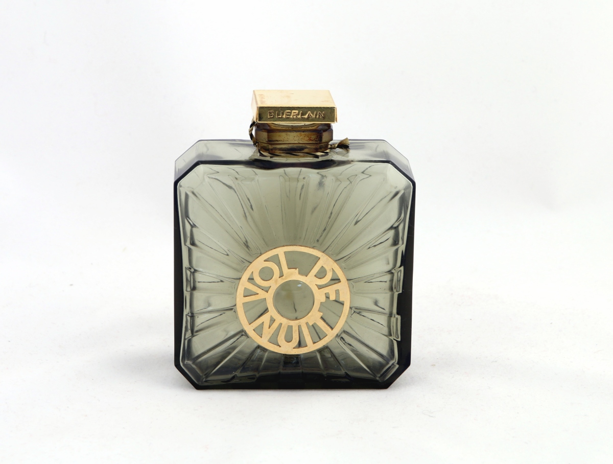 Lot comprenant un flacon en verre fumé pressé moulé de section rectangulaire, sa panse carrée à pans coupés, à décor rayonnant sur deux faces, leur étiquette en laiton ajouré ornant une face, leur bouchon carré plat gainé de laiton titré.