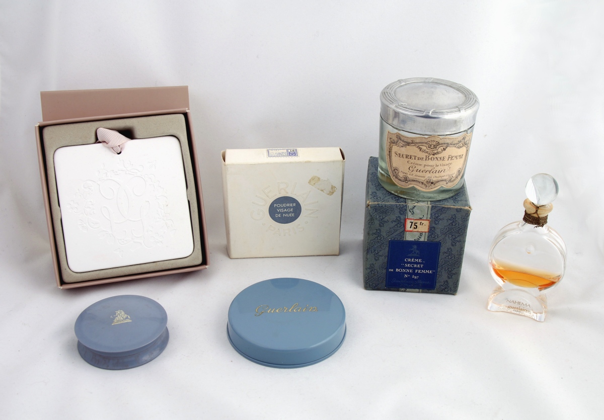 Lot comprenant une pampille parfumante, un boitier de poudre compacte, un boitier de fard "gai-minois", un pot de crème "Secret de Bonne Femme" avec étui carton, et un flacon d'extrait "Nahéma".