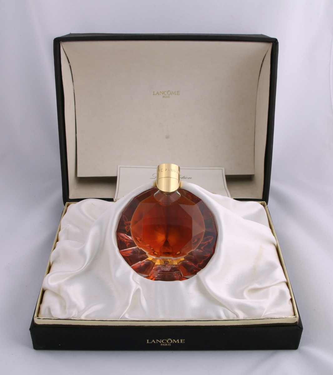 Présenté dans son coffret rectangulaire en carton gainé de tissus moiré noir, intérieur satin blanc, titré, flacon modèle "diamant" en verre incolore pressé moulé coiffé de sa capsule en zamac. (PdO)