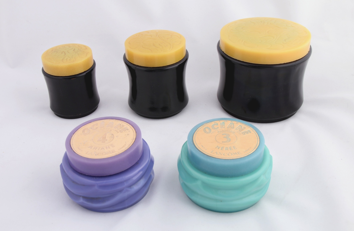 Lot de cinq pots de crème en verre opaque de différentes couleurs coiffés de leur capsule en polopaze moulée.