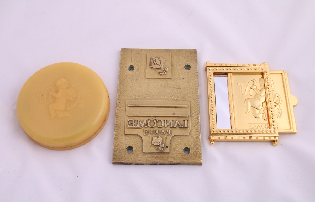 Lot comprenant une ancienne plaque d'imprimerie de la maison, un boitier à fard en polopaze, et un miroir publicitaire en zamac.
