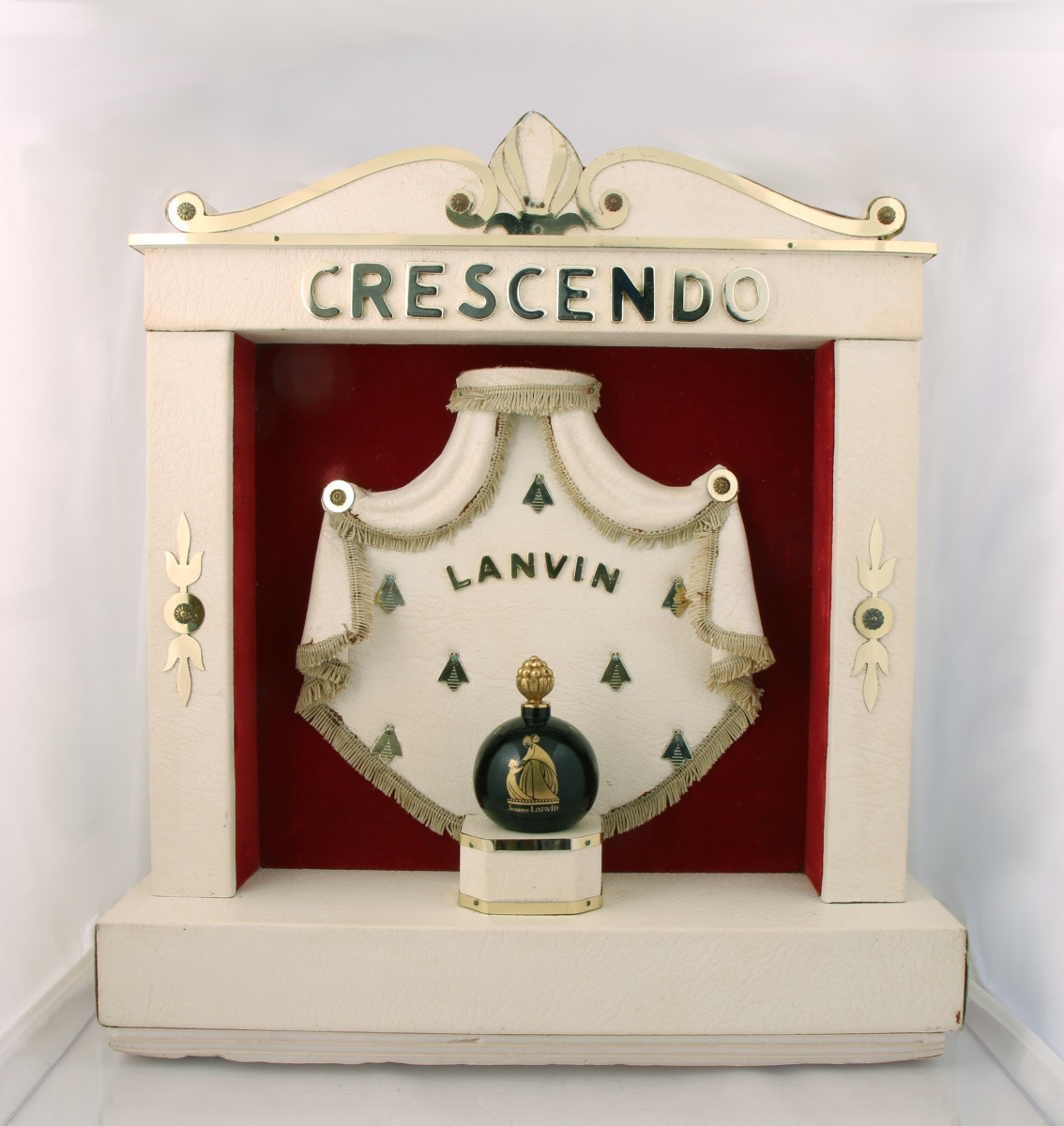 Rare objet publicitaire éclairant en bois gainé de papier et tissus figurant un petit théâtre, titré et siglé, contenant un flacon modèle "boule noire".