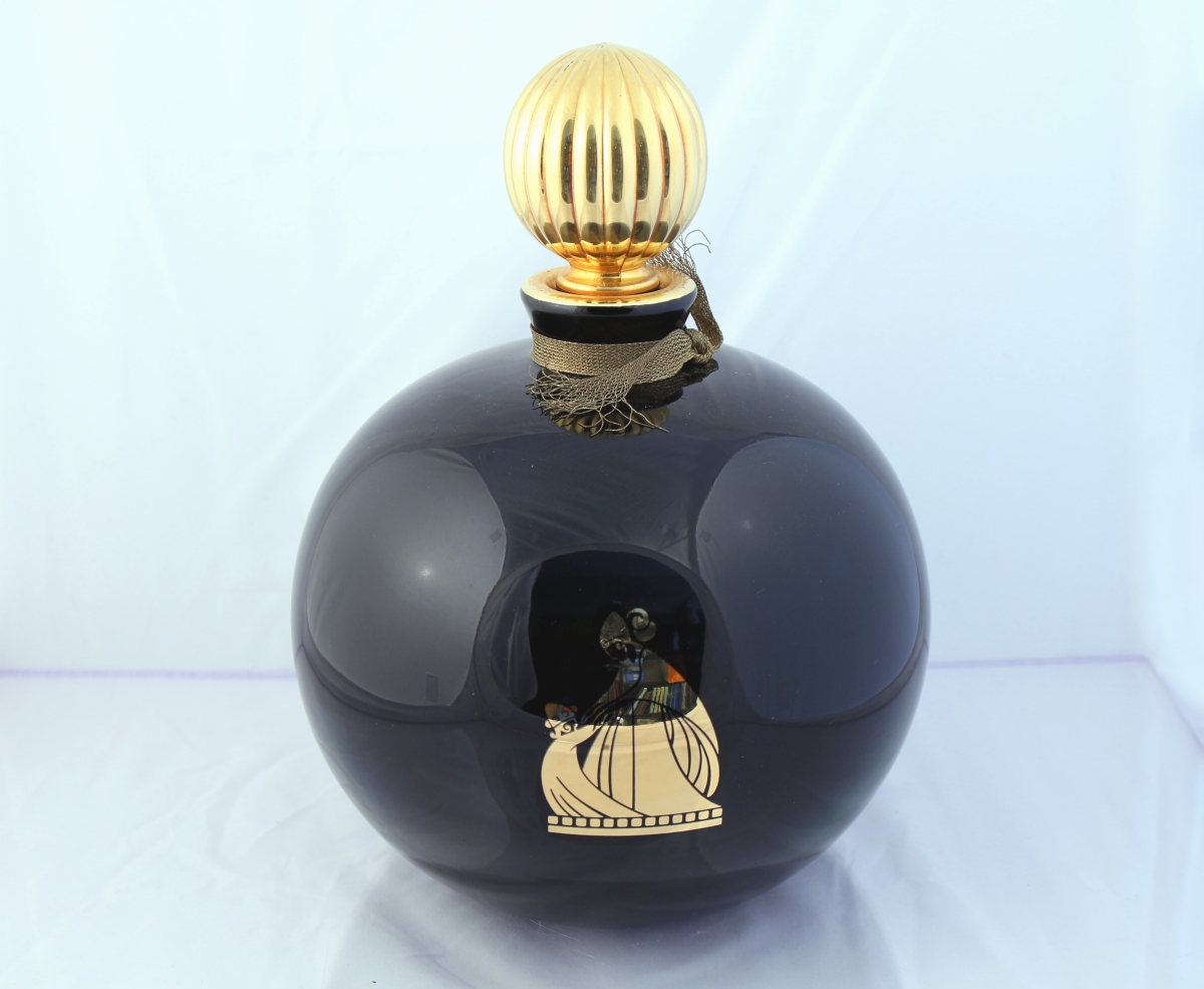 Flacon publicitaire décoratif modèle "boule noire" en verre opaque noir pressé moulé doré à la feuille au col, siglé, coiffé de son bouchon boule rainuré laqué or.