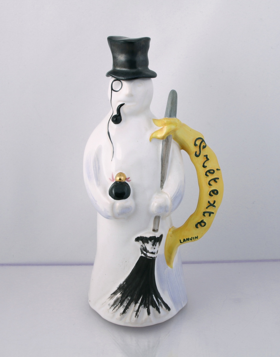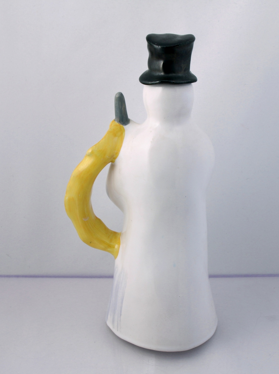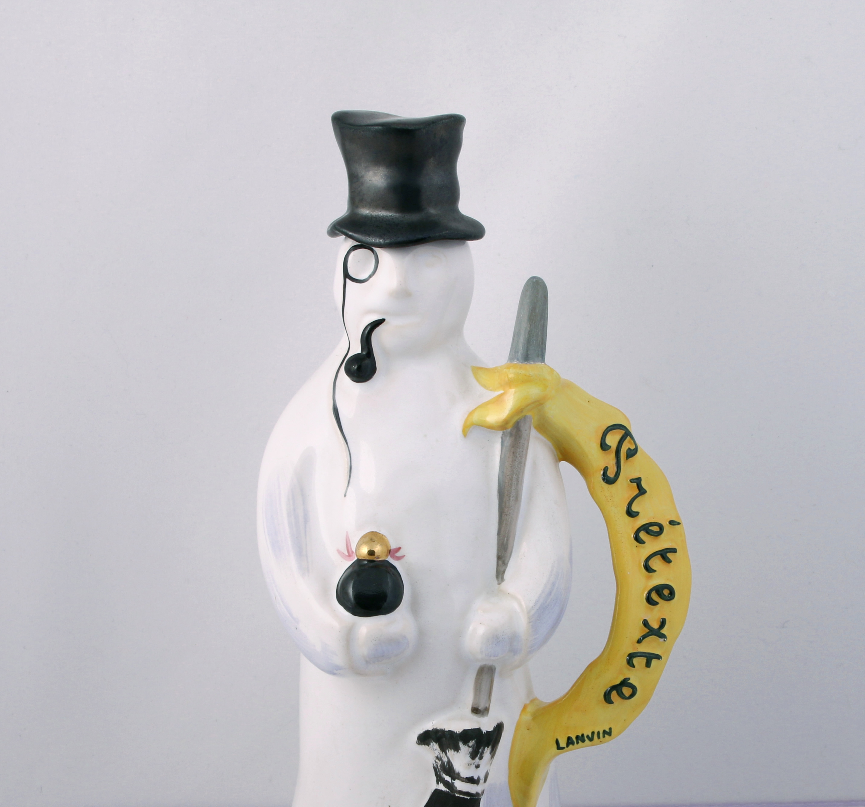 Flacon publicitaire en faience émaillée figurant un bonhomme de neige coiffé d'un chapeau haut de forme, sa tête faisant office de bouchon.