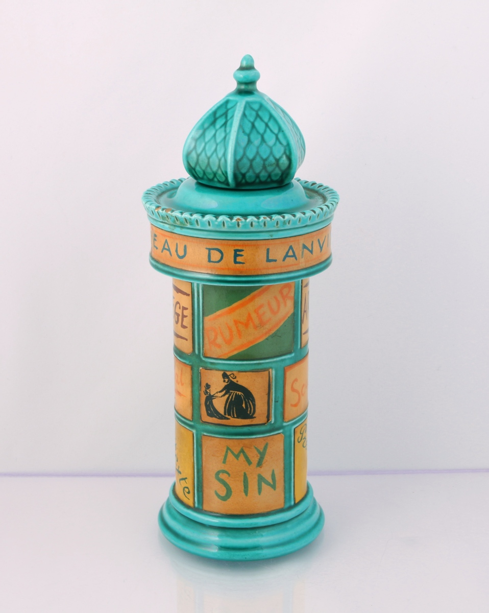 Flacon publicitaire en faience émaillée polychrome figurant une colonne Morris avec ses affiches polychromes titrées avec chaque nom de parfum de la maison.