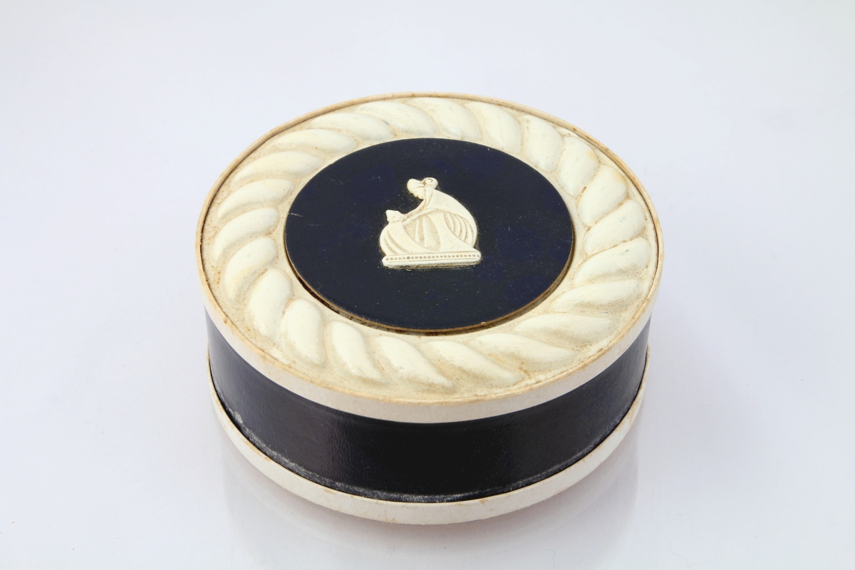 Boite de poudre bicolore cylindrique forme tambour en carton et résine, son couvercle à décor de cordages. (PdO)
