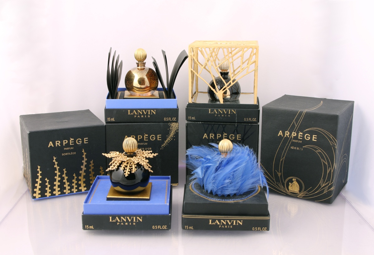 Ensemble de quatre flacons modèles "boule noire" éditions limitées avec leur coffret carton: "Sortilège" , "Reflets d'Or" , "Jardin d'Or" et "Rêve Bleu". (PdO)
