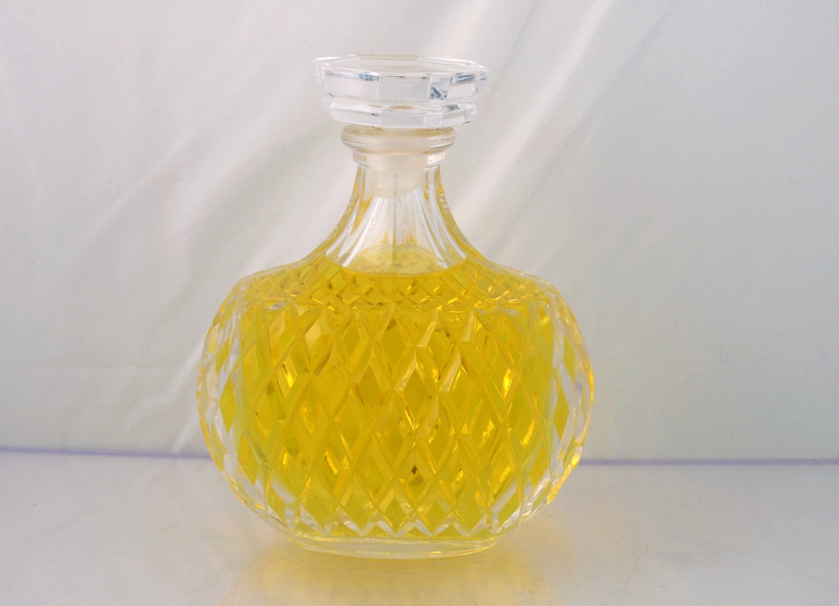 Flacon en cristal incolore pressé moulé de section ovale, sa panse bulbeuse à décor de losanges gravés, haut col facetté, coiffé de son bouchon octogonal plat.