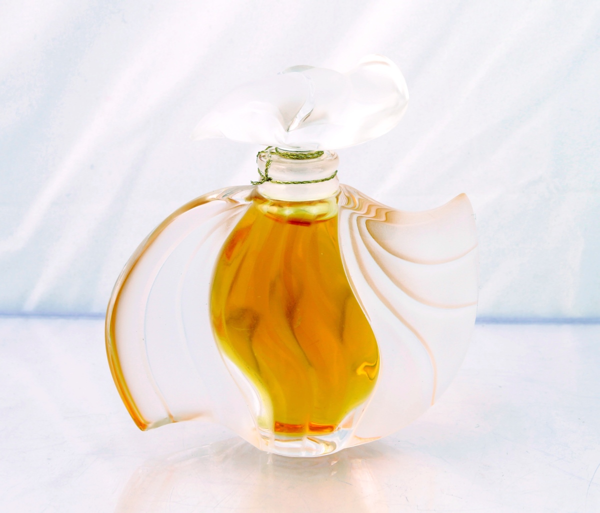 Flacon édité par Lalique cristal commémorant le 40ème anniversaire de ce parfum mythique en cristal incolore pressé moulé partiellement dépoli de section cylindrique, sa panse à décor de draperies rainurées, coiffé de son bouchon assorti. Signé.