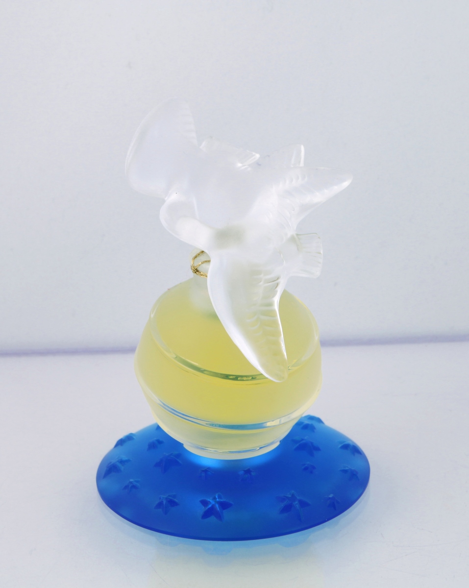 Édition grand-luxe commémorant les 60ans de ce parfum mythique: flacon en cristal incolore pressé moulé dépoli satiné de section cylindrique en forme de sphère rainurée, coiffé de son bouchon cristal figurant deux colombes aux ailes déployées, disposé sur disque en cristal bleu à décor moulé d'étoiles.