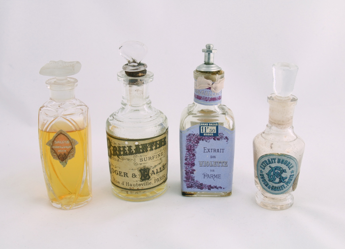 Lot comprenant quatre flacons en verre incolore pressé moulé avec leur étiquette, parfums "Salvia", "Violette de Parme", "Extrait Double" et Brillantine surfine.