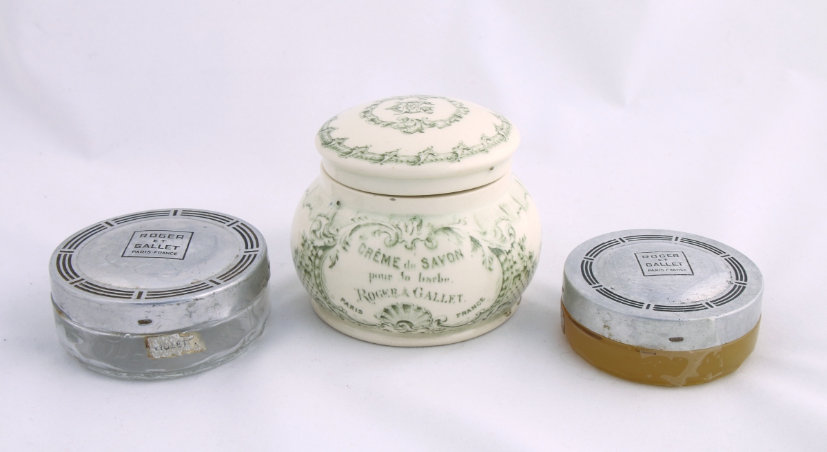 Lot composé de deux pots de brillantine forme tambour en verre incolore pressé moulé avec capsule métal et un pot de savon à barbe en faience émaillée de Creil Montereau à décor baroque.