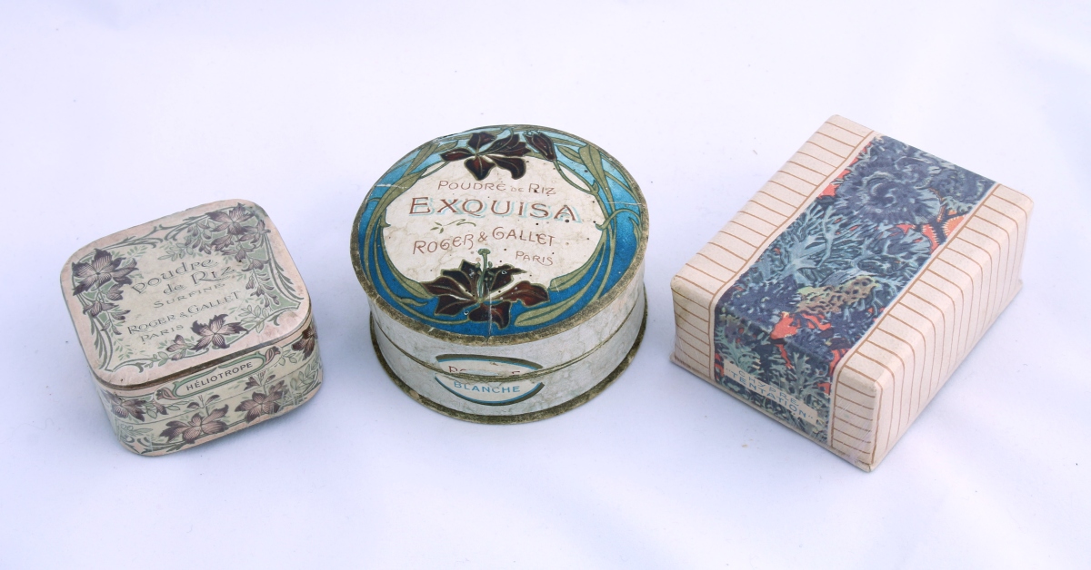 Lot de trois boites de poudre en carton gainé de papier polychrome titré: un modèle "Exquisa" , un modèle "Chypre Tentation" et un modèle "Surfine".