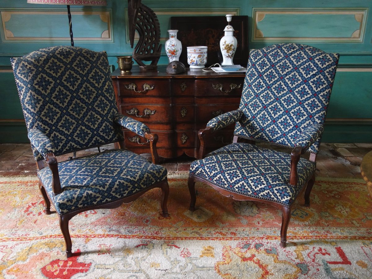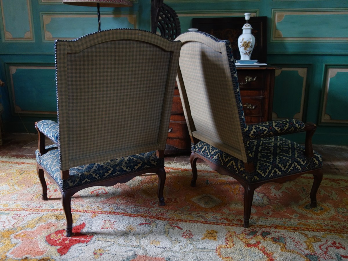 PAIRE de FAUTEUILS à haut dossier en noyer mouluré. Ceintures chantournées reposant sur des pieds cambrés à sabots de biche.