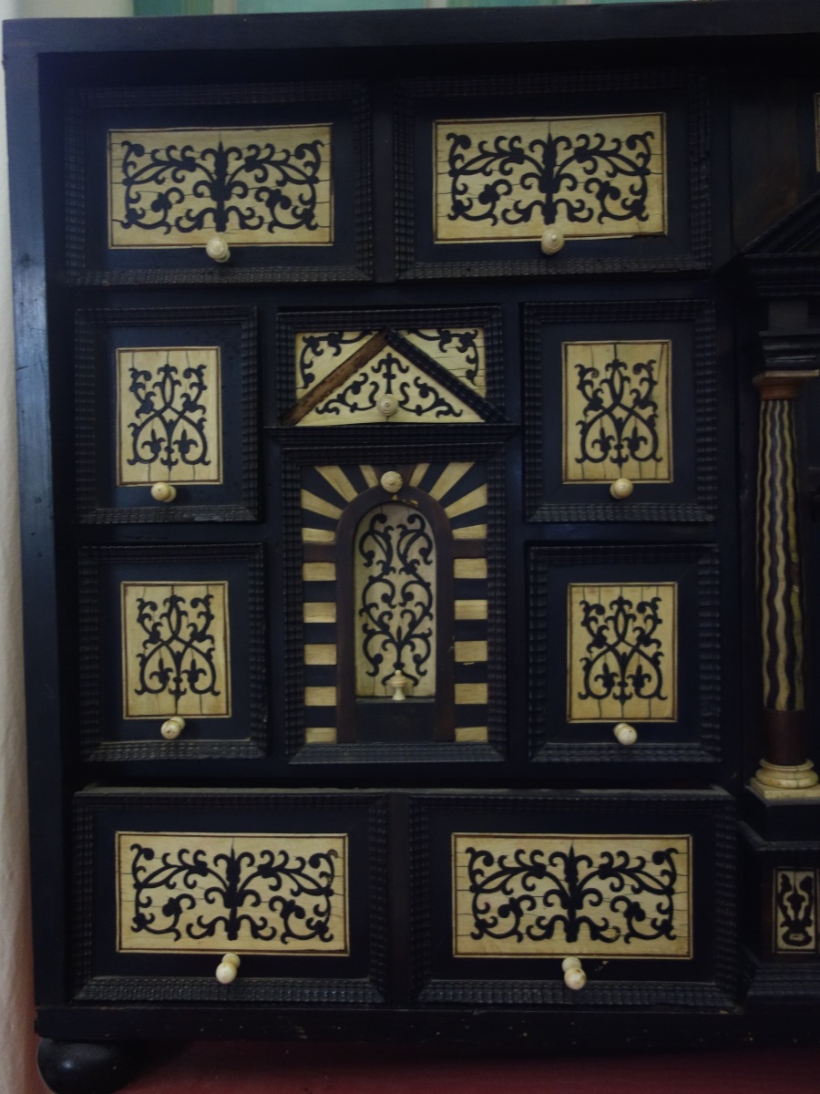 GRAND CABINET à poser en ébène et bois noirci à décor de motifs géométriques en ivoire. Il ouvre à 19 tiroirs encadrant un vantail à colonnes soutenant un fronton, découvrant une niche en théâtre.