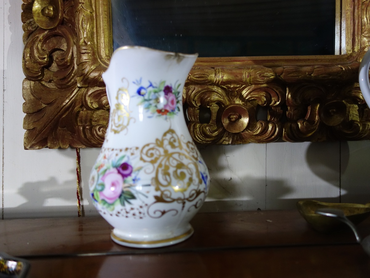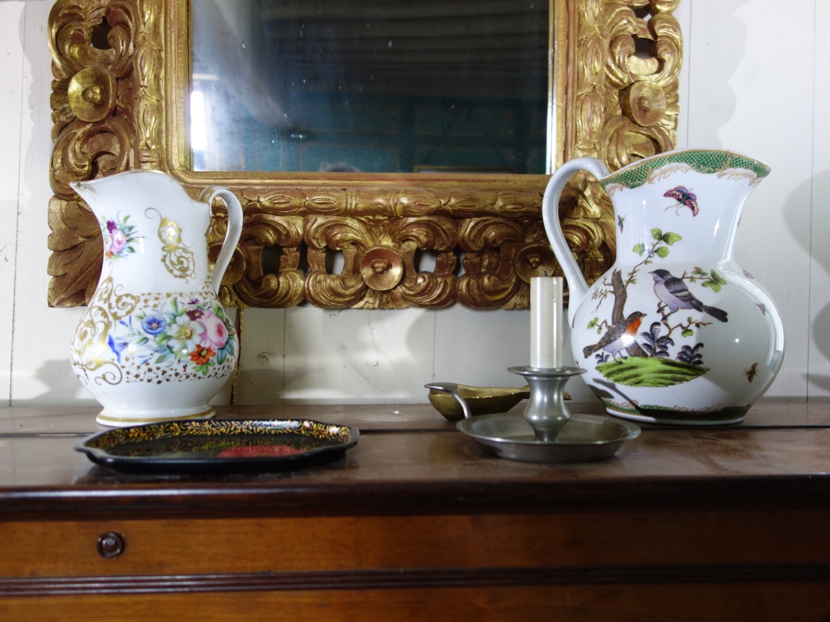Deux PICHETS en céramique dont un en porcelaine et divers souvenirs sur le piano.