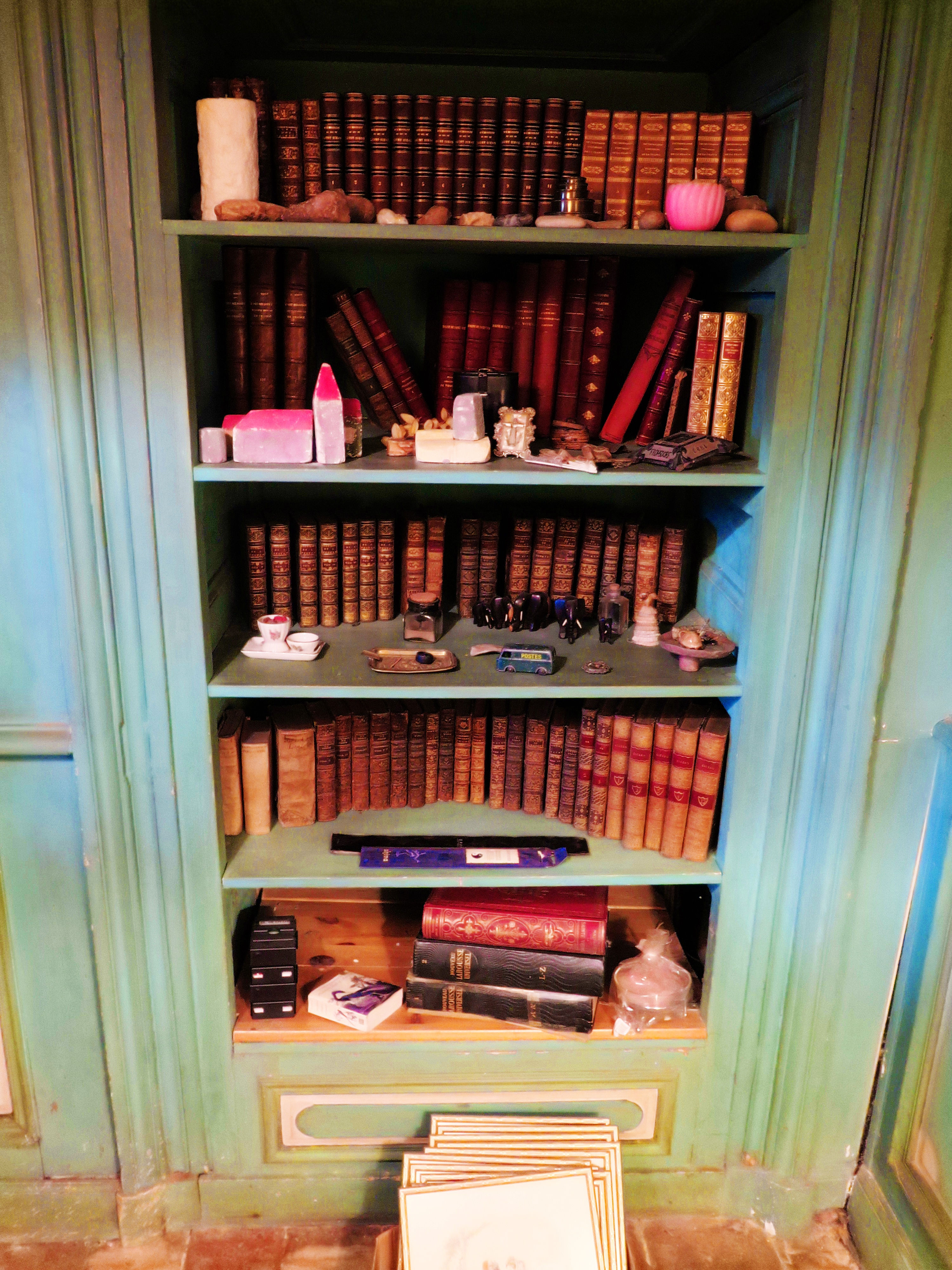 RÉUNION de SOUVENIRS, BIBELOTS et LIVRES dans une étagère.