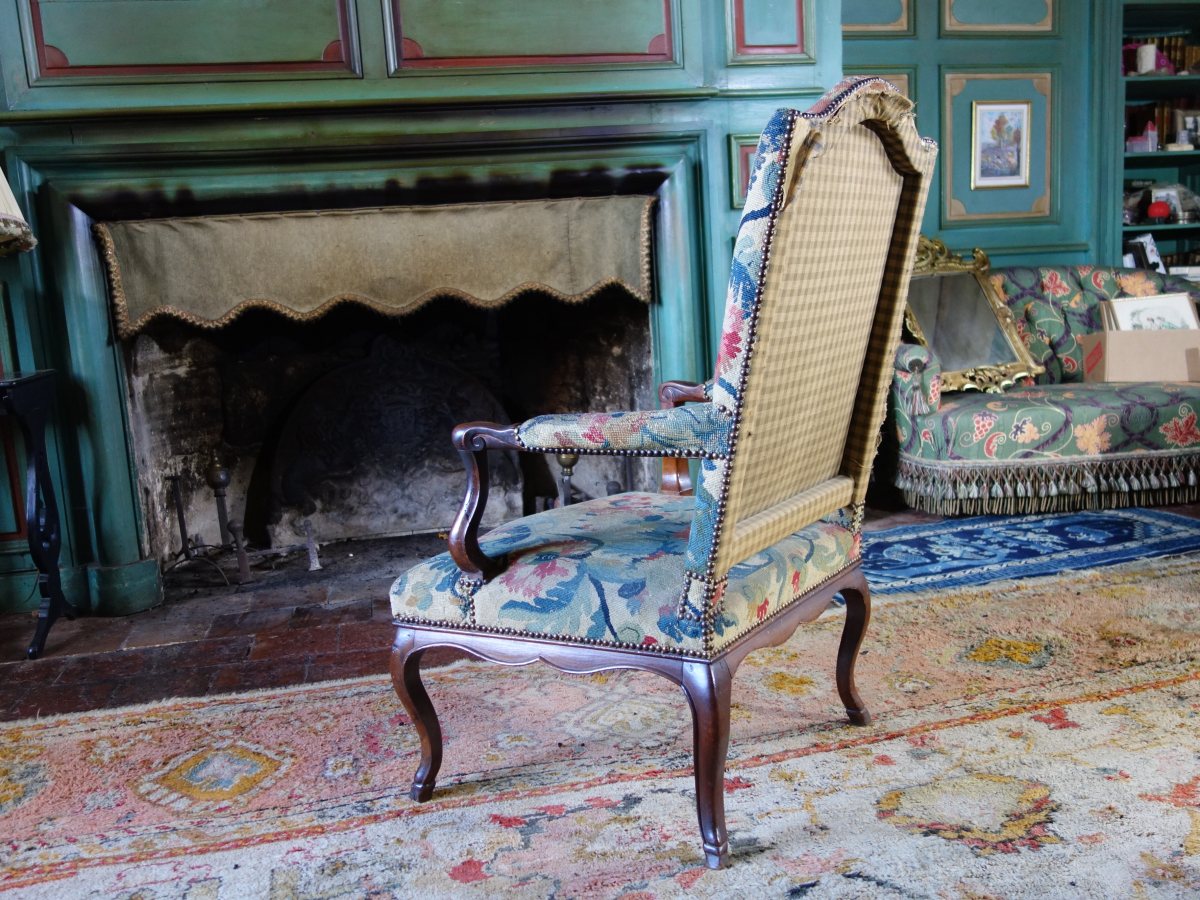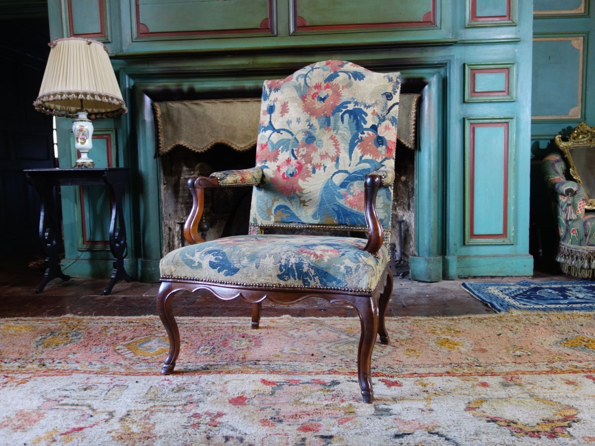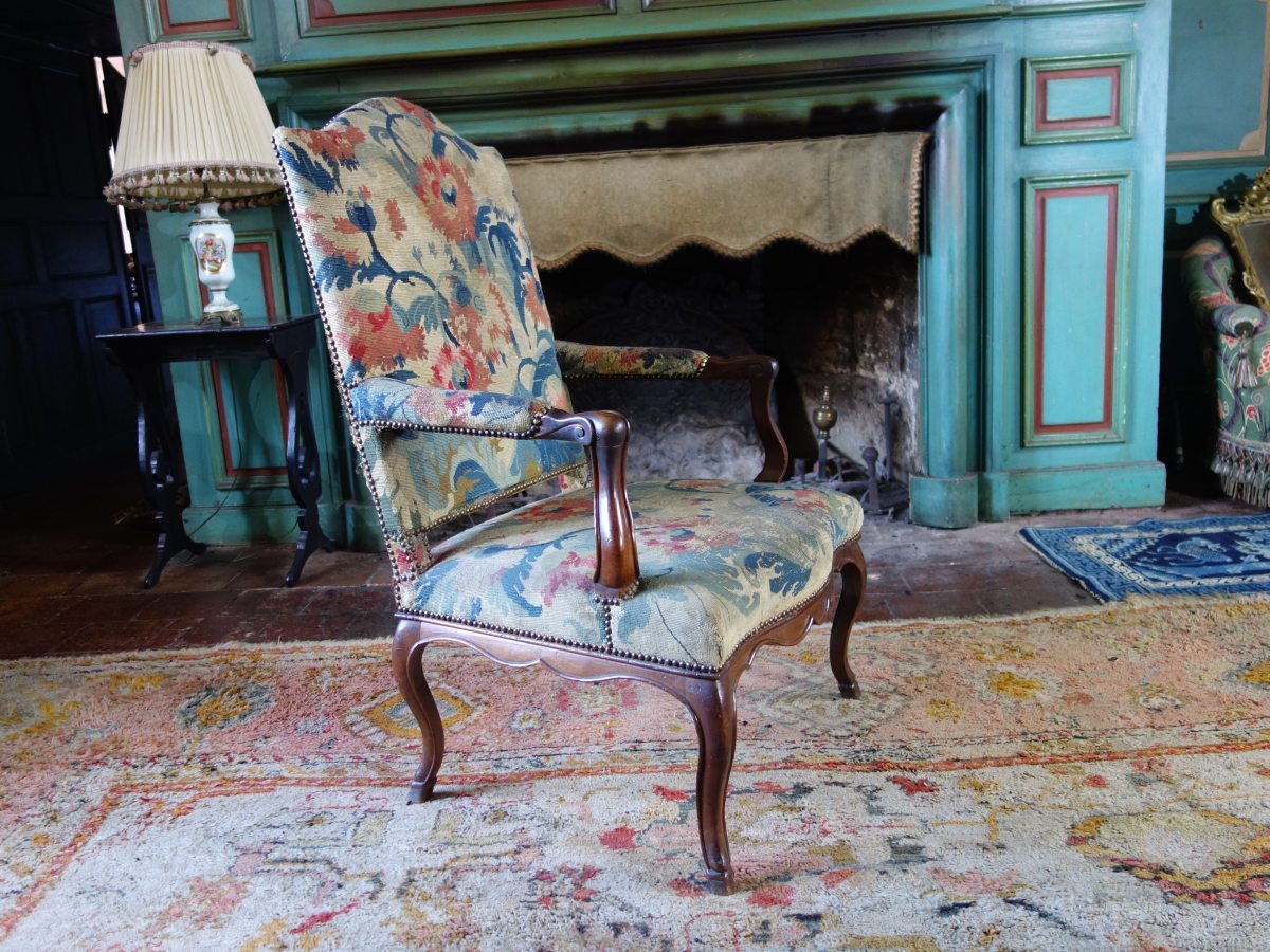 FAUTEUIL à haut dossier en noyer mouluré. Ceinture chantournée reposant sur des pieds cambrés à sabots de biche.