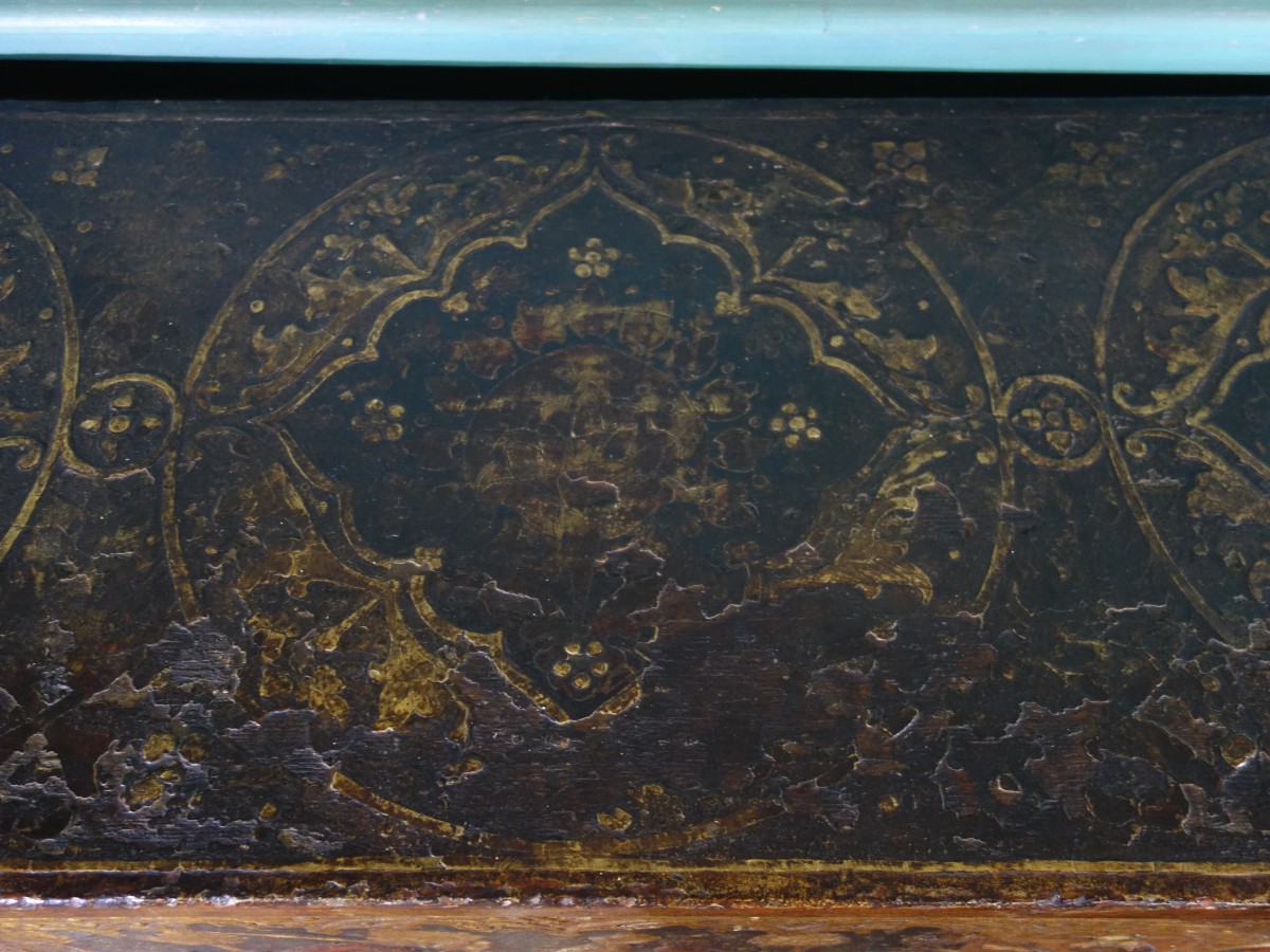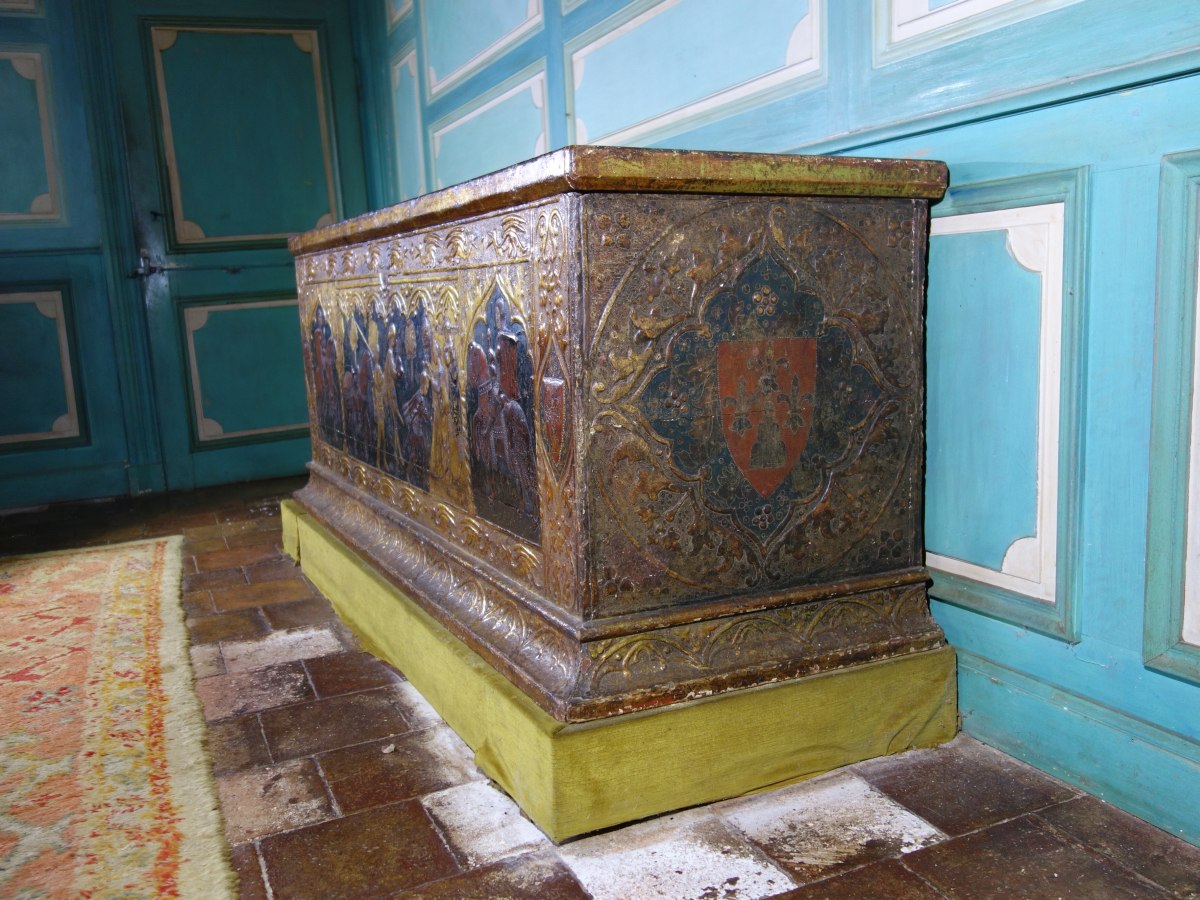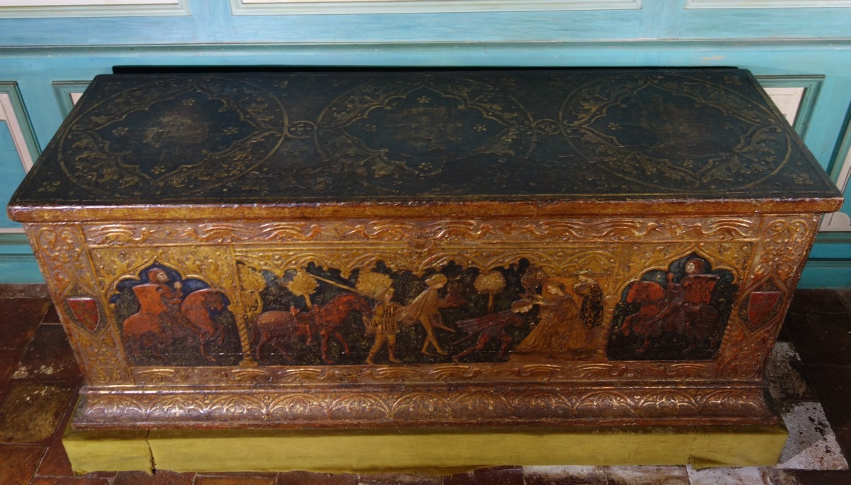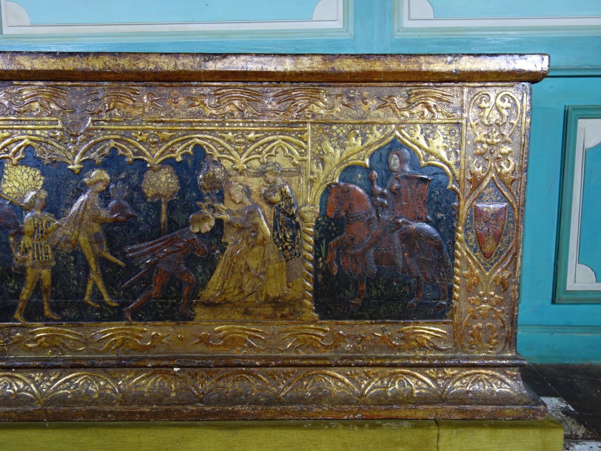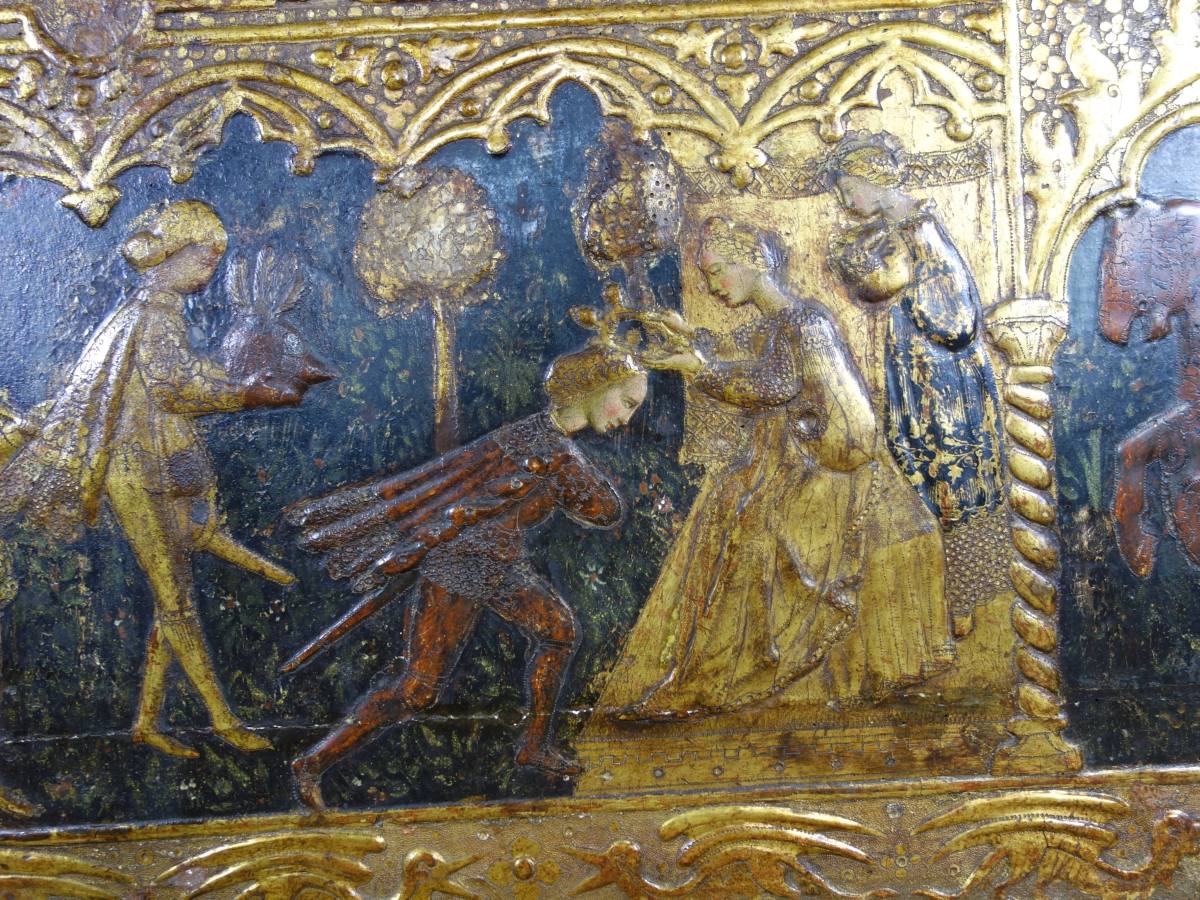COFFRE en bois à décor polychrome et or, à décor sur quatre faces, représentant en façade trois scènes de chevalier, encadrées d'armoiries.