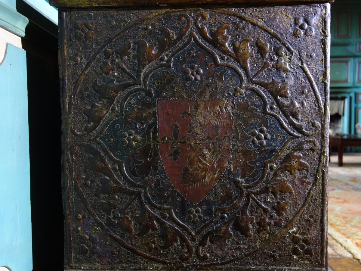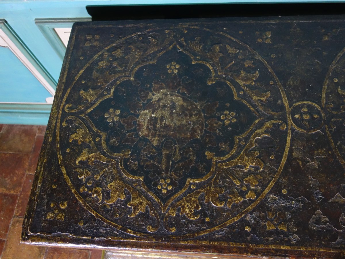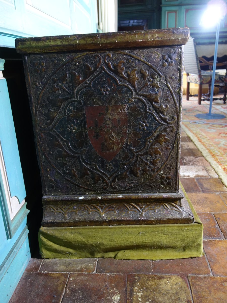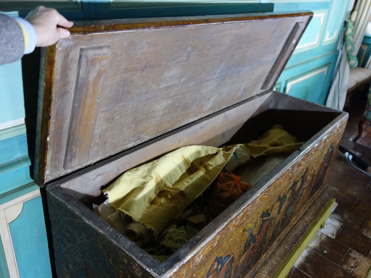 COFFRE en bois à décor polychrome et or, à décor sur quatre faces, représentant en façade trois scènes de chevalier, encadrées d'armoiries.