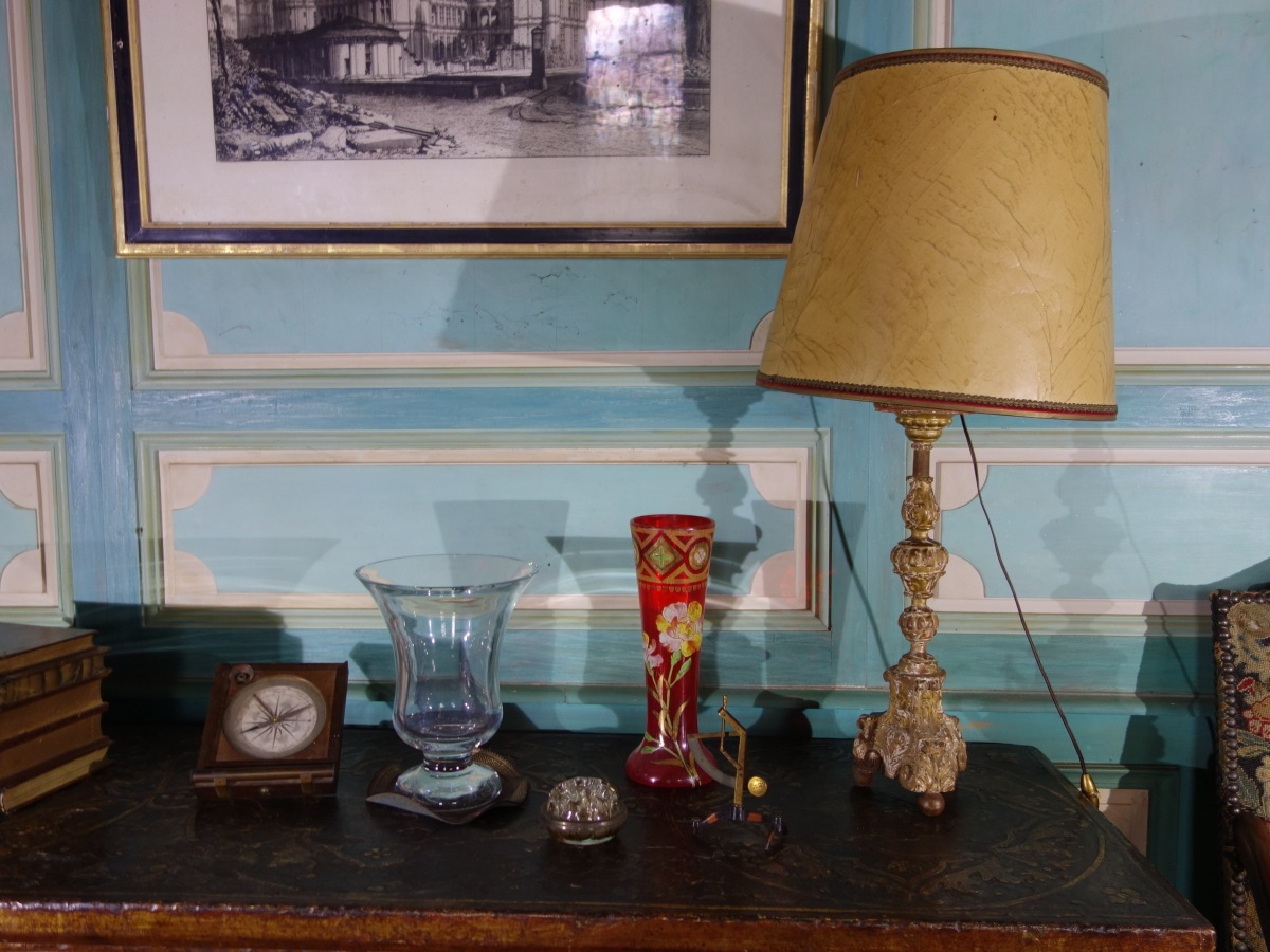 Deux VASES, un pique-fleurs, une lampe et autres bibelots sur le coffre.