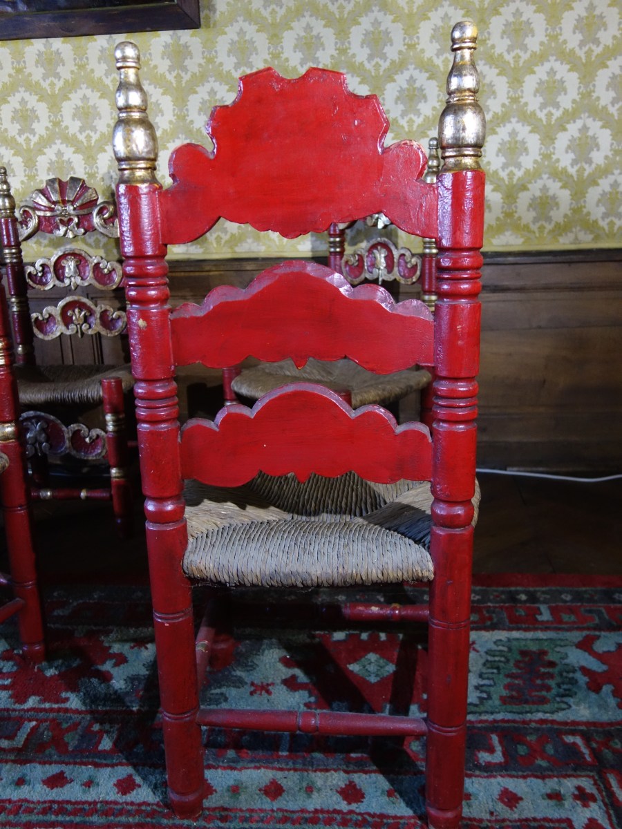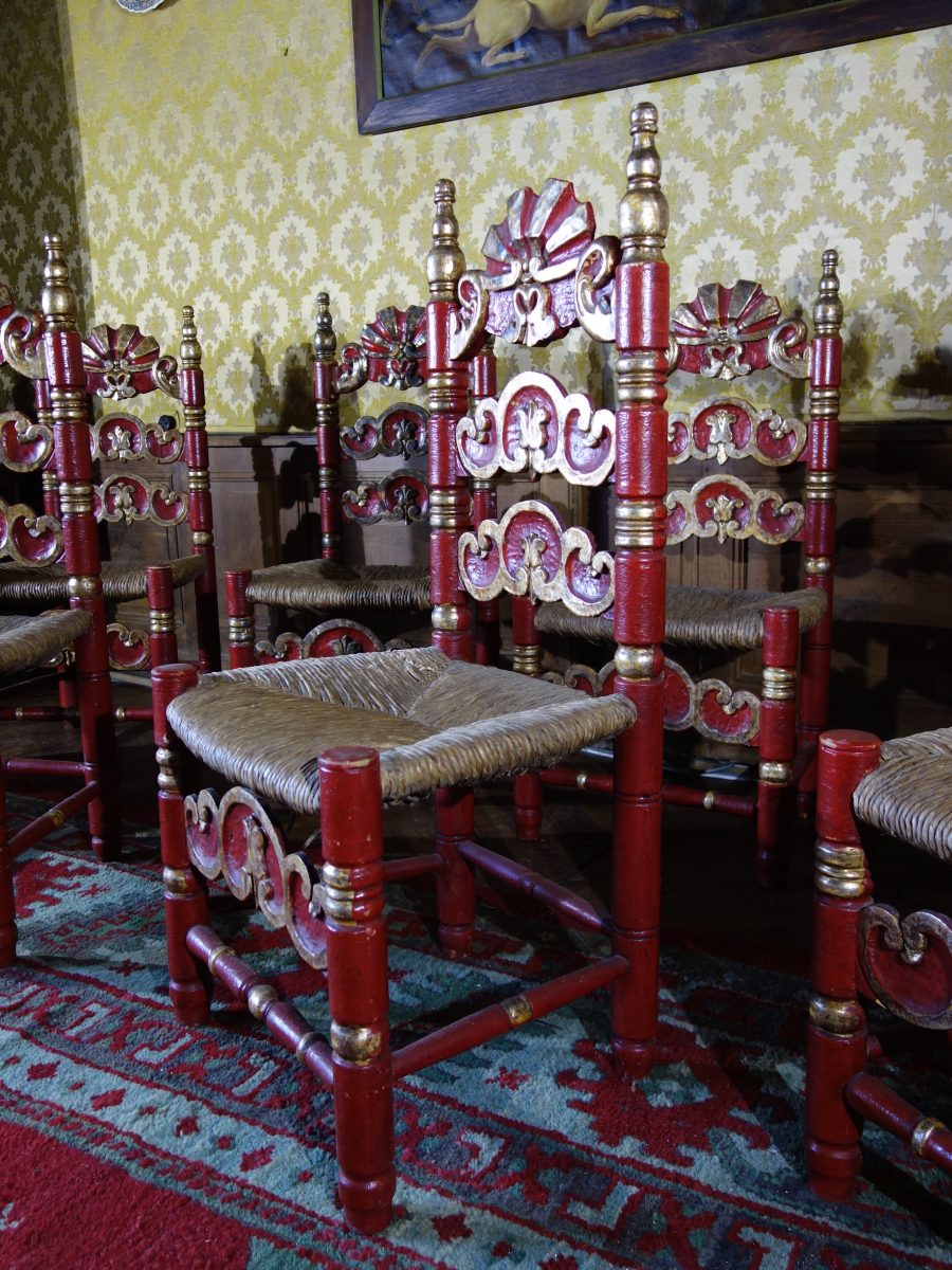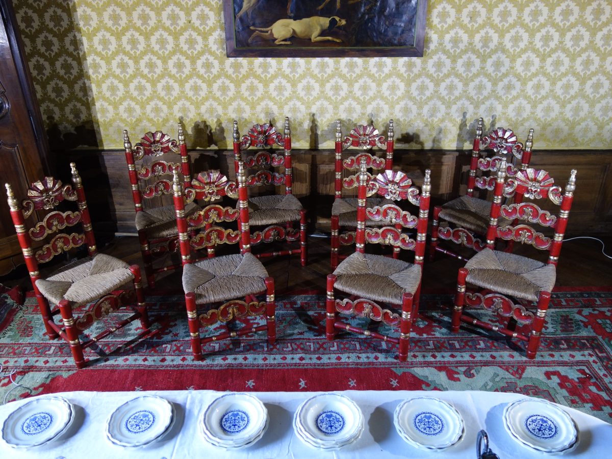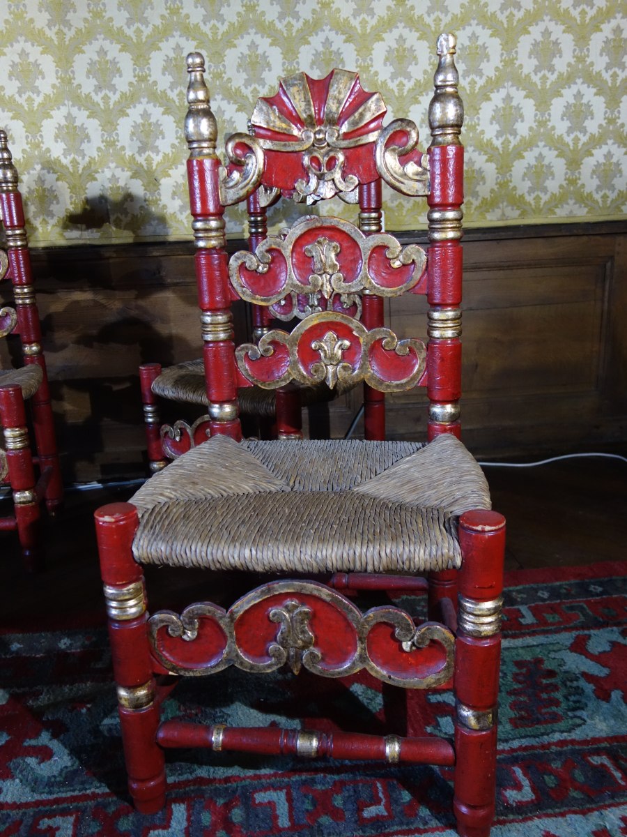 SUITE de Huit CHAISES en bois polychrome rouge et or.