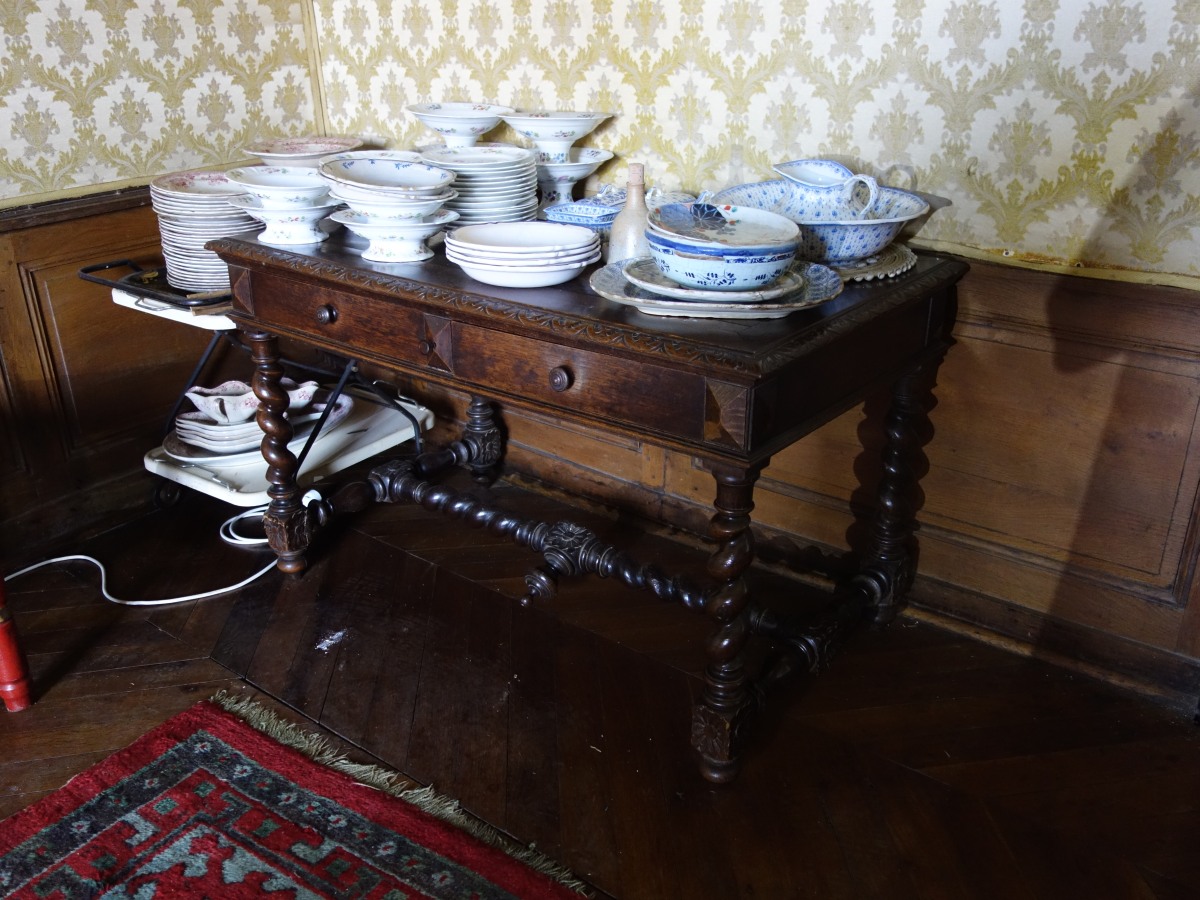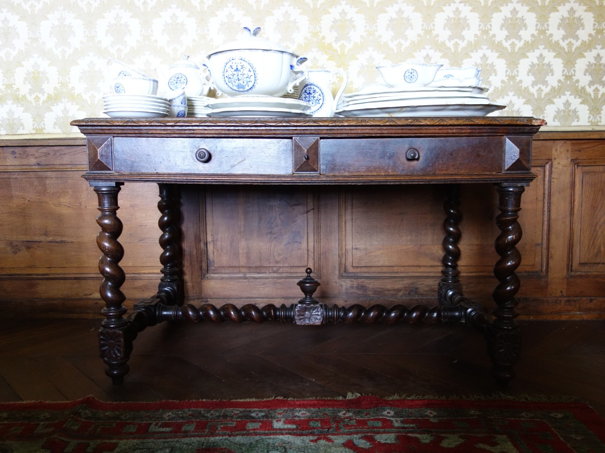 Paire de TABLES en chêne mouluré et sculpté, de forme rectangulaire, ouvrant à deux tiroirs, reposant sur des colonnes torses, réunies par une entretoise en ""H"".