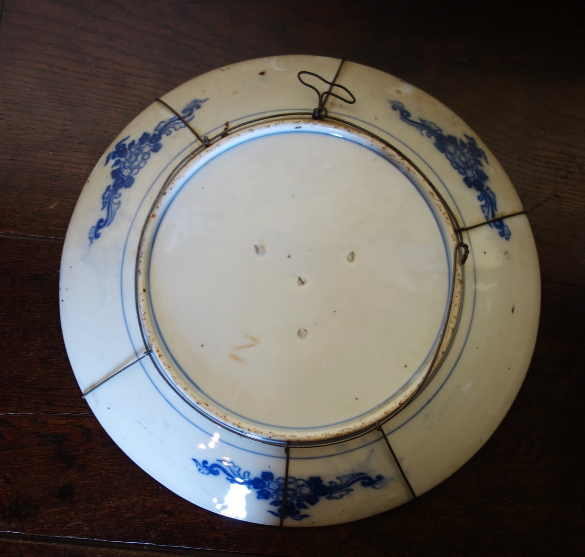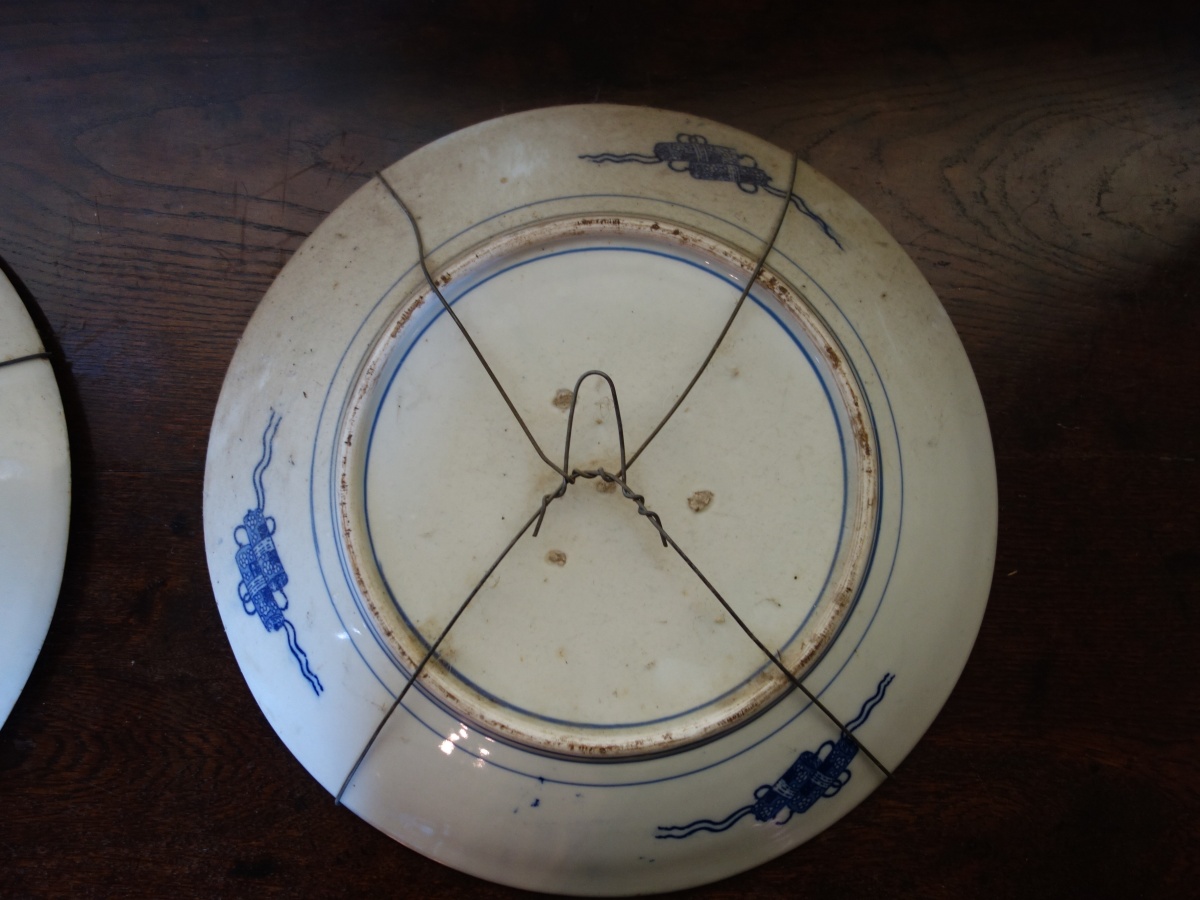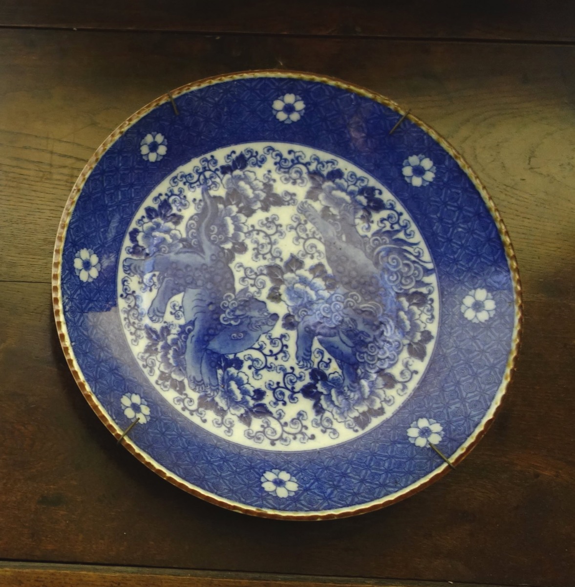 CHINE. Paire de PLATS en porcelaine bleue et blanche ornés de deux lions jouant.