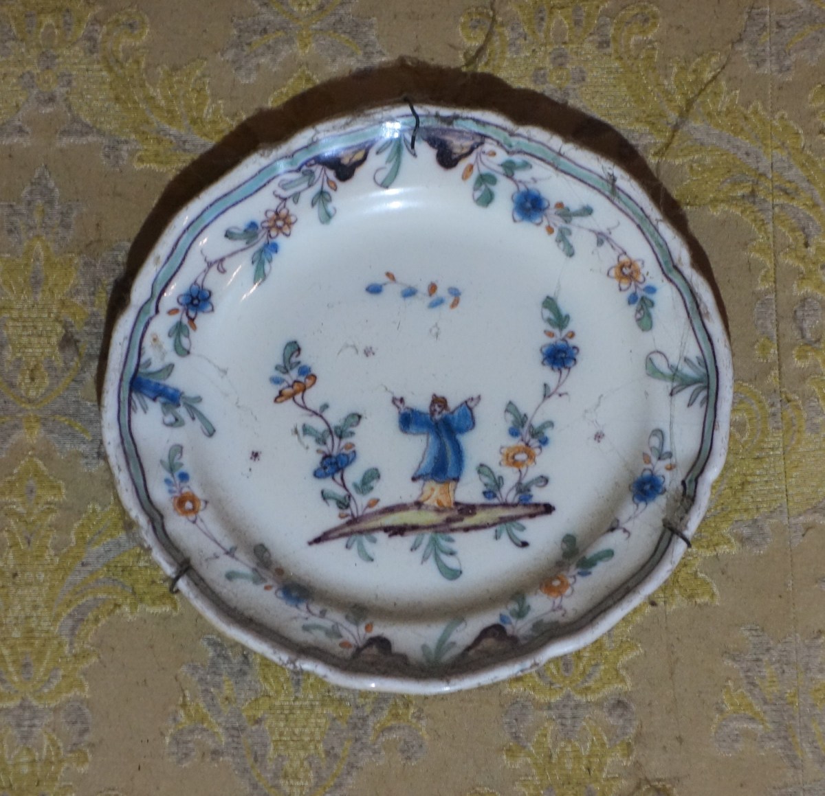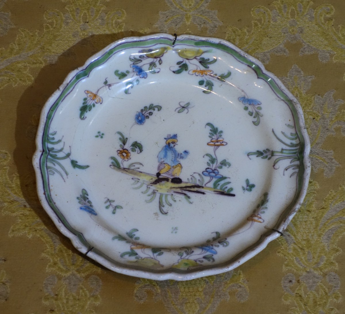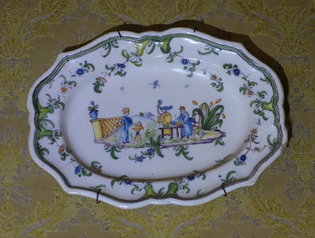 MOUSTIER? Un PLAT et deux d'ASSIETTES en faïence au décor au chinois avec des guirlandes.