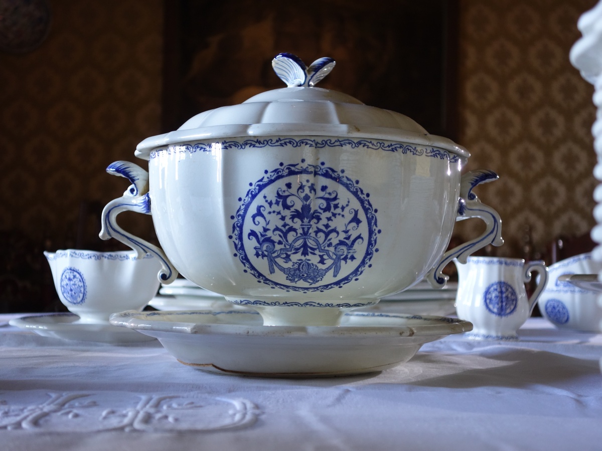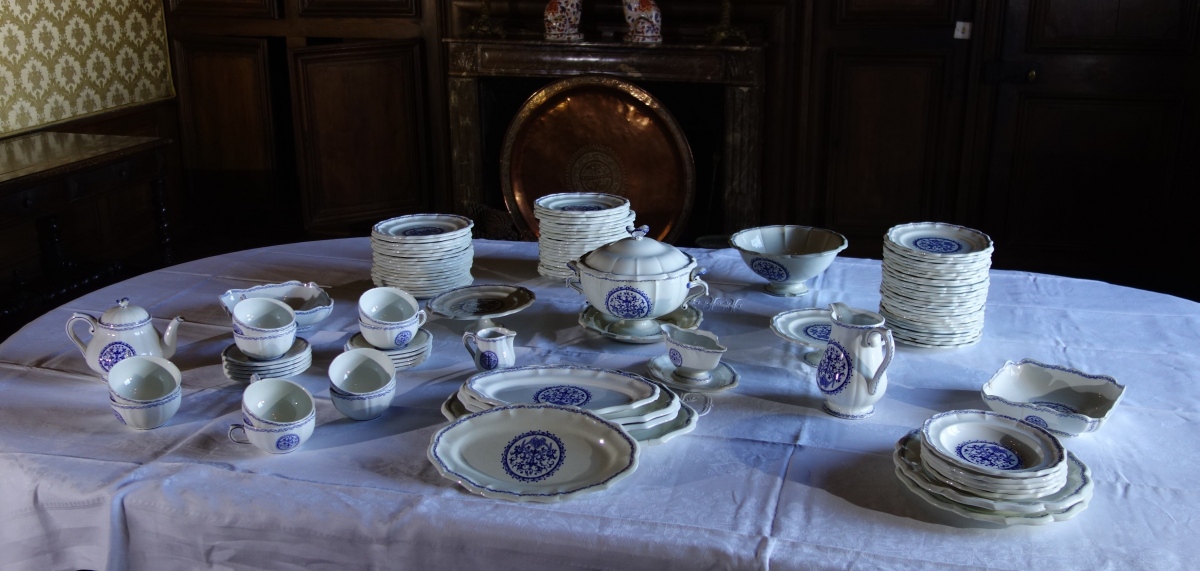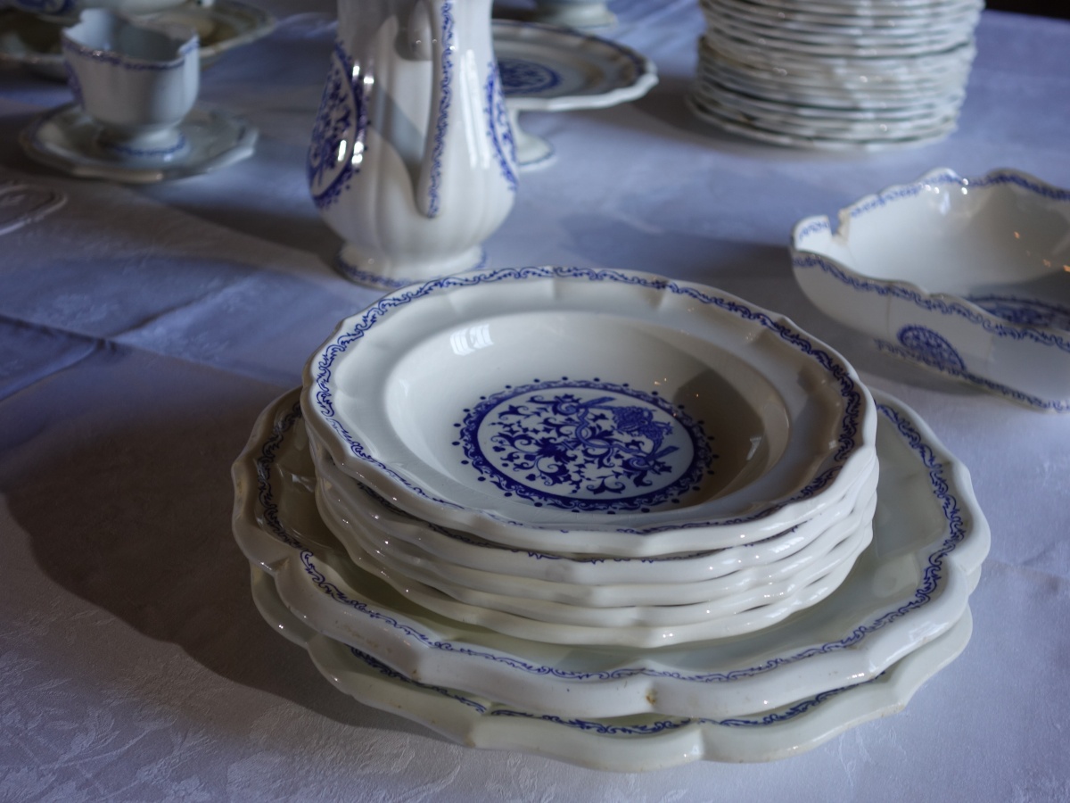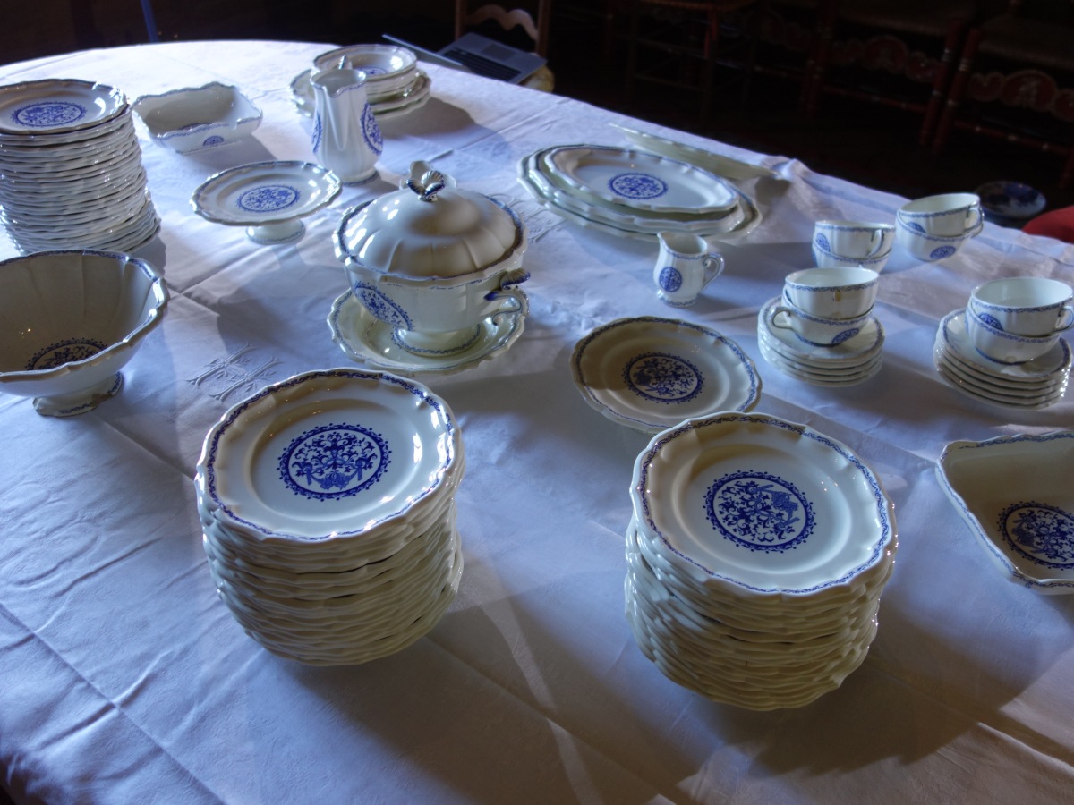 GIEN. SERVICE en en faïence émaillée bleu et blanche d’un décors dans le gout de Delft, d’environ 112 pièces, notamment: