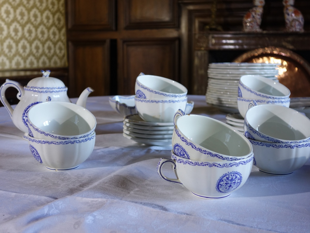 Un service à thé: théière, pot à lait, pichet, 10 tasses et sous-tasses