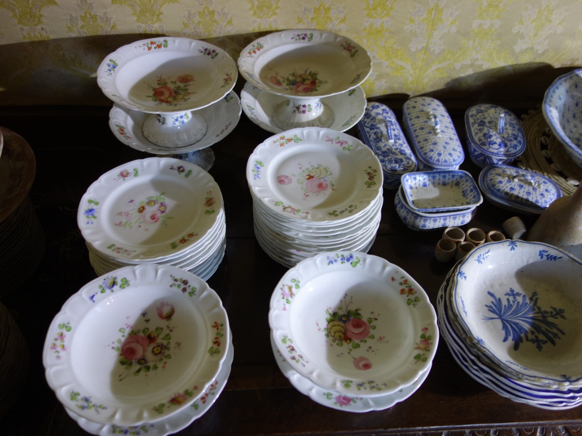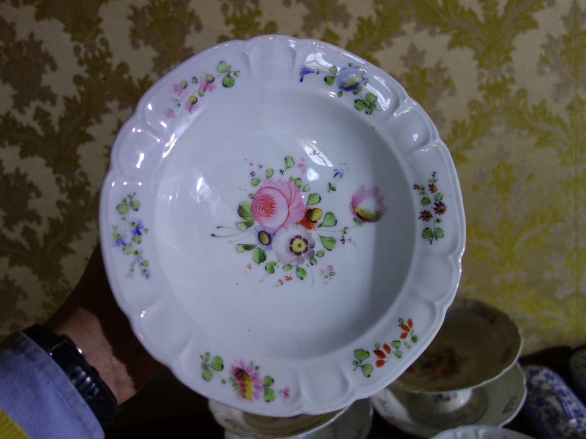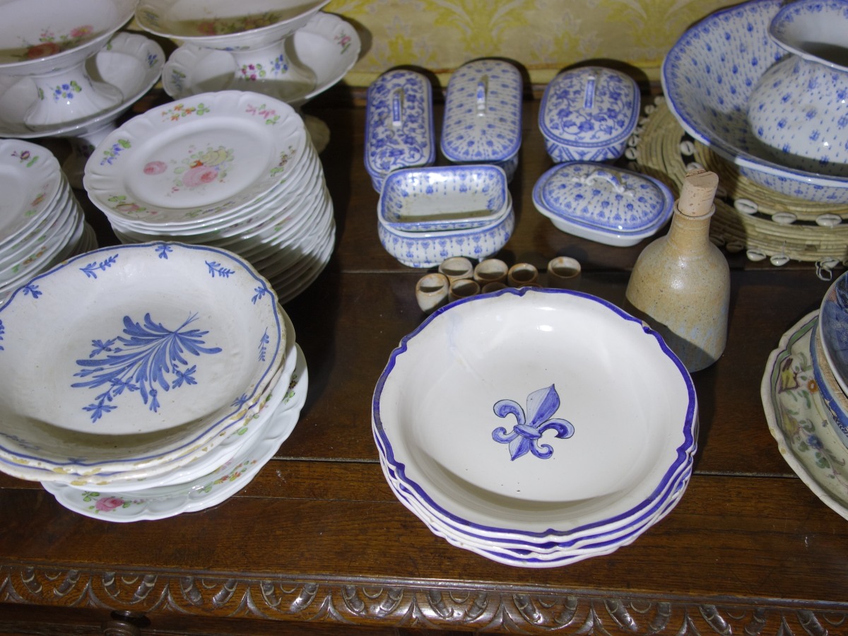 Réunion de VAISSELLE en céramique, notamment: service à dessert en porcelaine peinte de bouquets de fleurs avec assiettes et coupes sur talon, service de nuit en faïence bleue et blanche, cinq assiettes fleurdelisées..