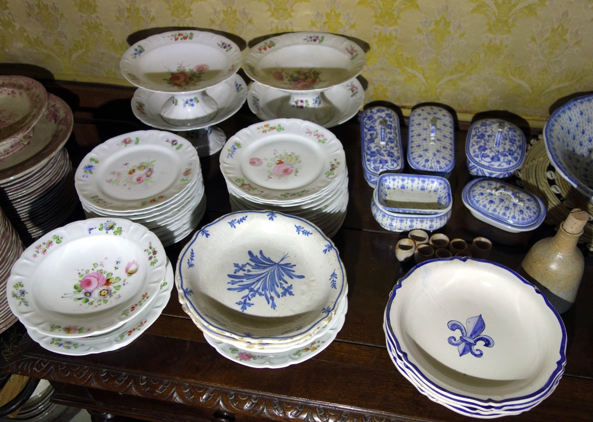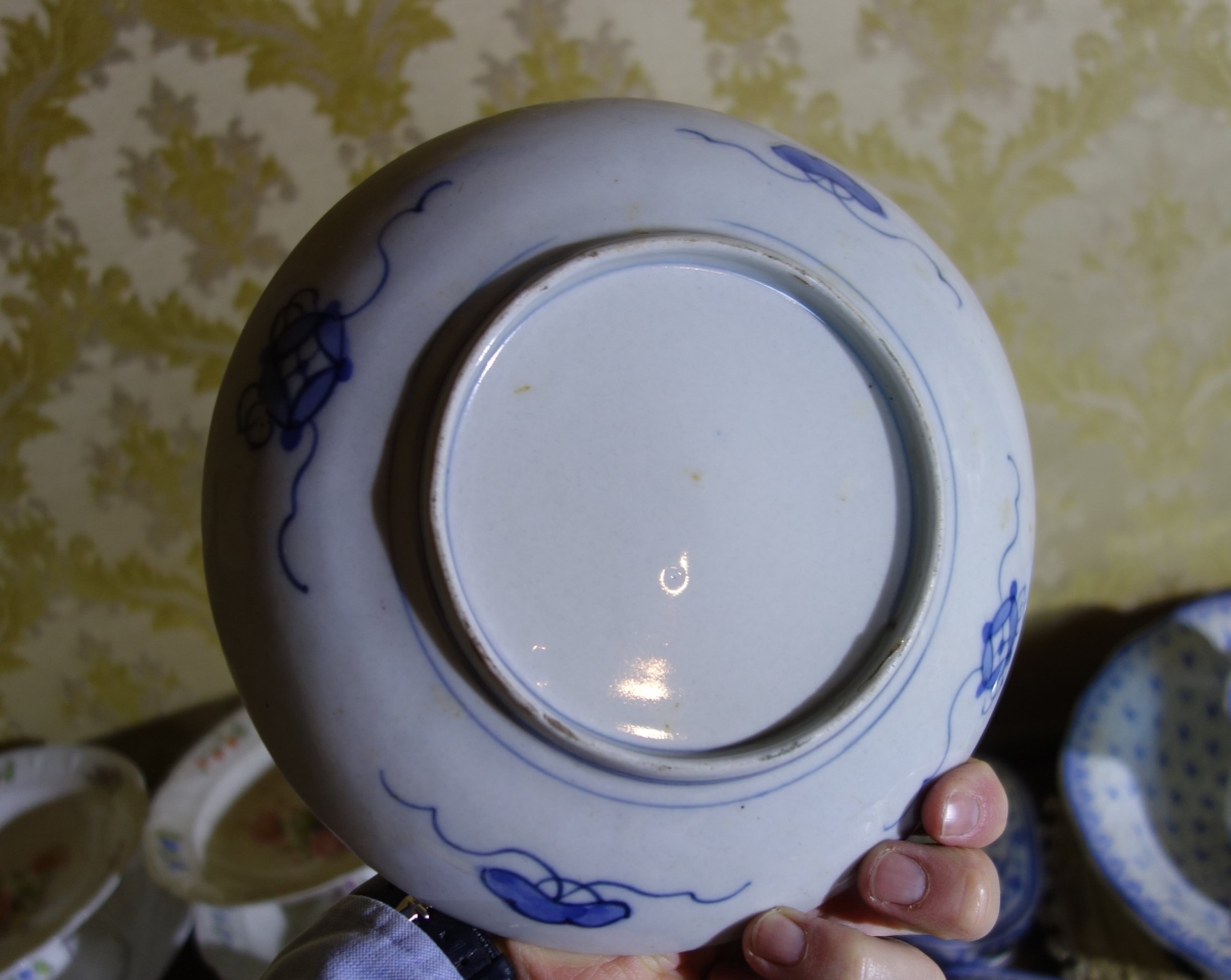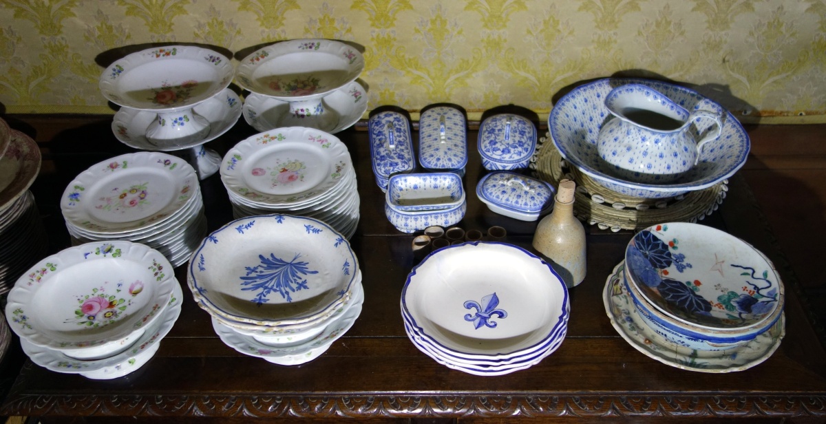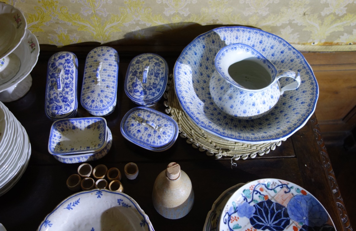 Réunion de VAISSELLE en céramique, notamment: service à dessert en porcelaine peinte de bouquets de fleurs avec assiettes et coupes sur talon, service de nuit en faïence bleue et blanche, cinq assiettes fleurdelisées..
