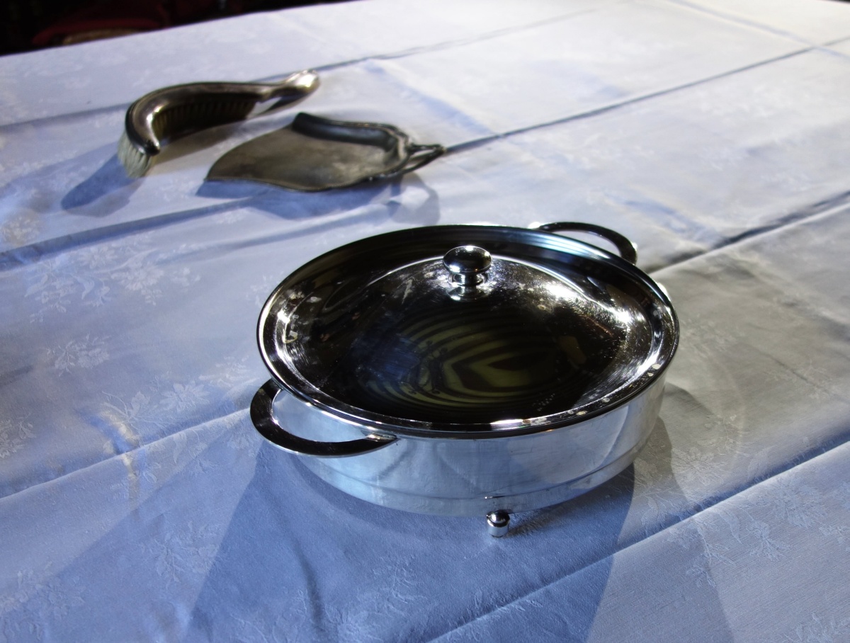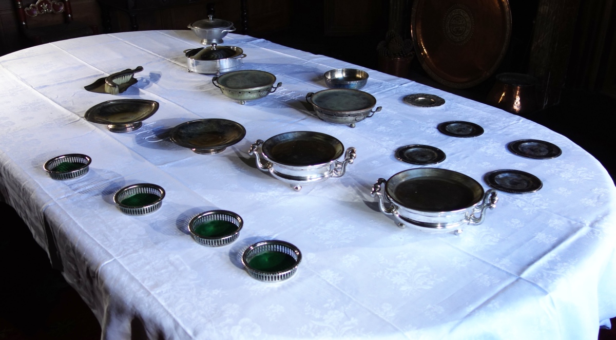 20 pièces de SERVICE en métal argenté, comprenant: 4 chauffes-plats, 4 petites corbeilles à bouteilles, 5 dessous de bouteilles, 2 coupes sur talon, 1 pelle et sa brosse, et 3 pièces de forme.