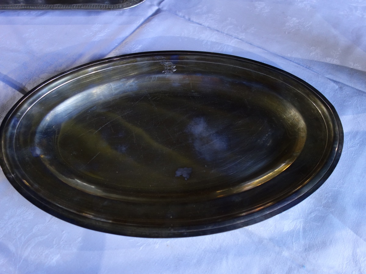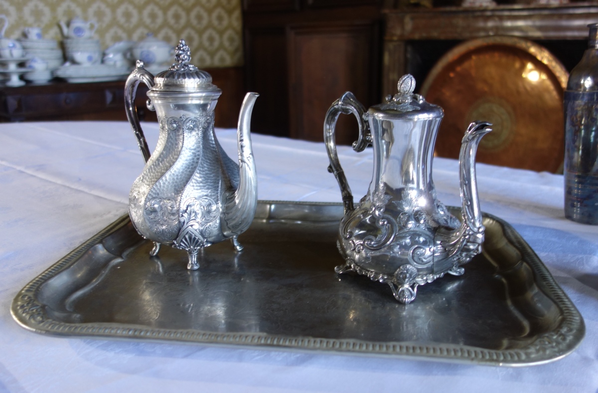 10 pièces de SERVICE en métal argenté, comprenant: 1 plateau, 1 plat ovale, 2 pichets, 3 verseuses dont 1 égoïste, 1 shaker et 2 timbales.