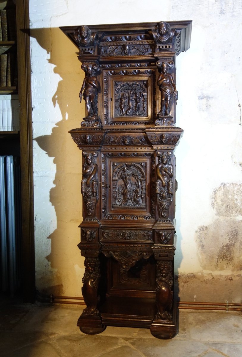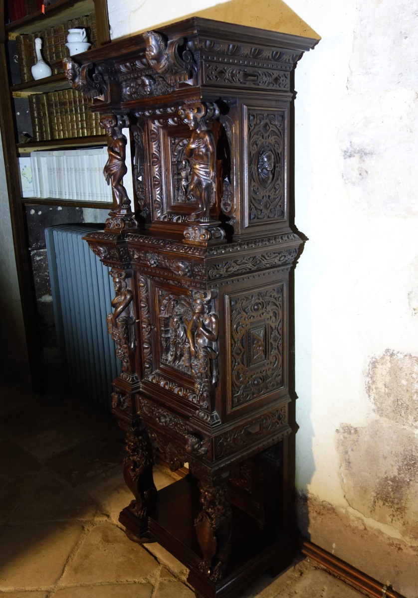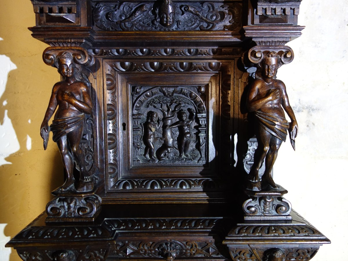 CABINET en chêne sculpté, composé d'un piètement en console aux lions en parade, les deux parties superposées ouvrent à un tiroir et chacune par un vantail à décor de scènes religieuses, encadré d'atlantes et de cariatides supportant la corniche.