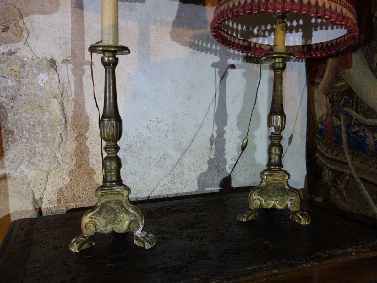 JOINT: PAIRE de PIQUES CIERGE en bois sculpté et doré. XVIIIe siècle. (En l'état). Haut.: 56,5 cm.