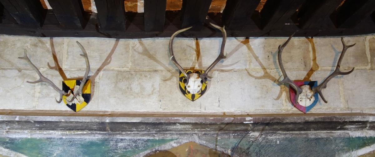 Suite de sept TROPHÉES de CHASSE, composés principalement de massacres de cerfs et cervidés.
