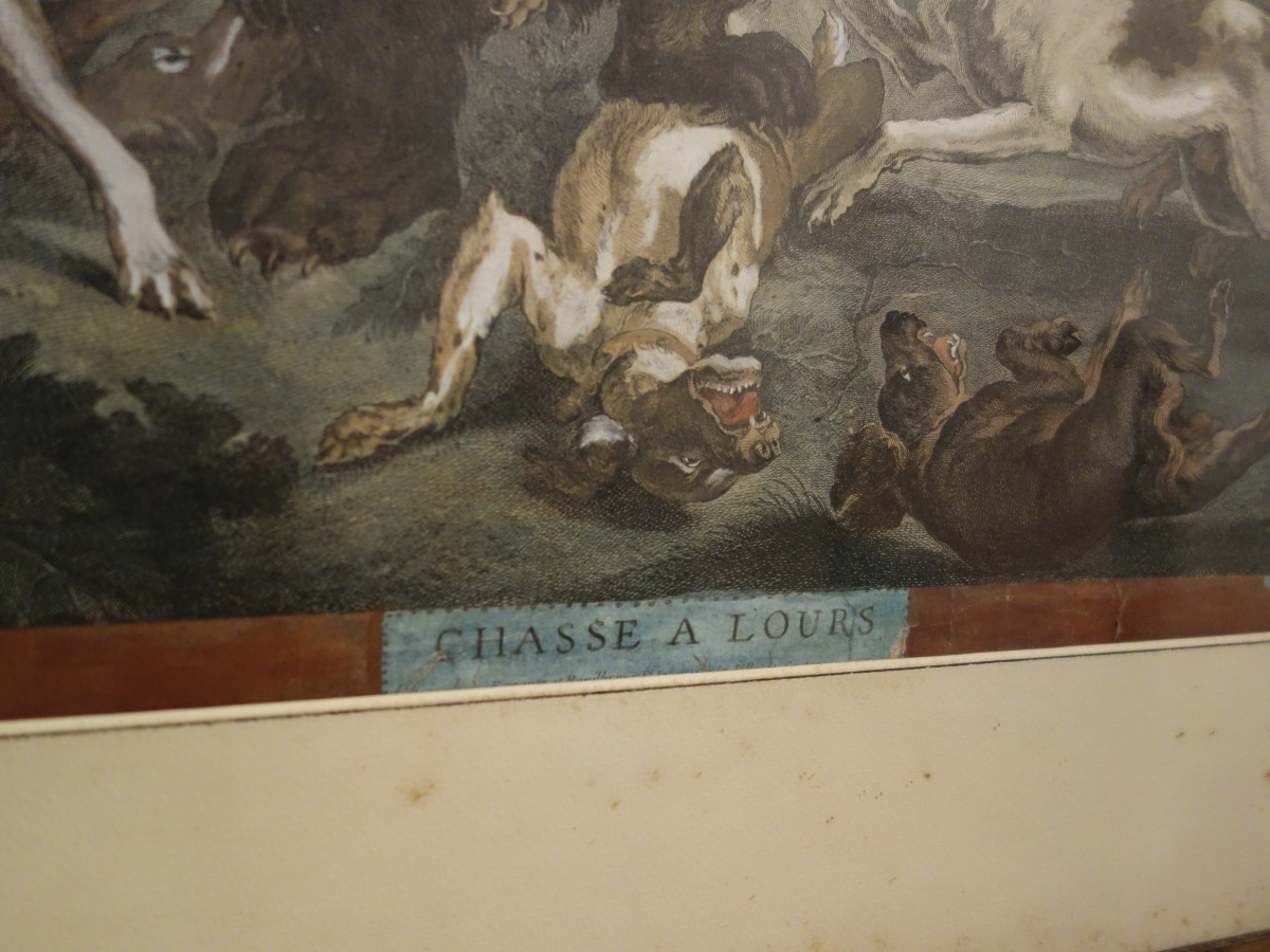 Eau forte rehaussée en couleur et titrée justifiée: « Hondius pinx. JE Rehn aqua forti et Chenu perficit ».