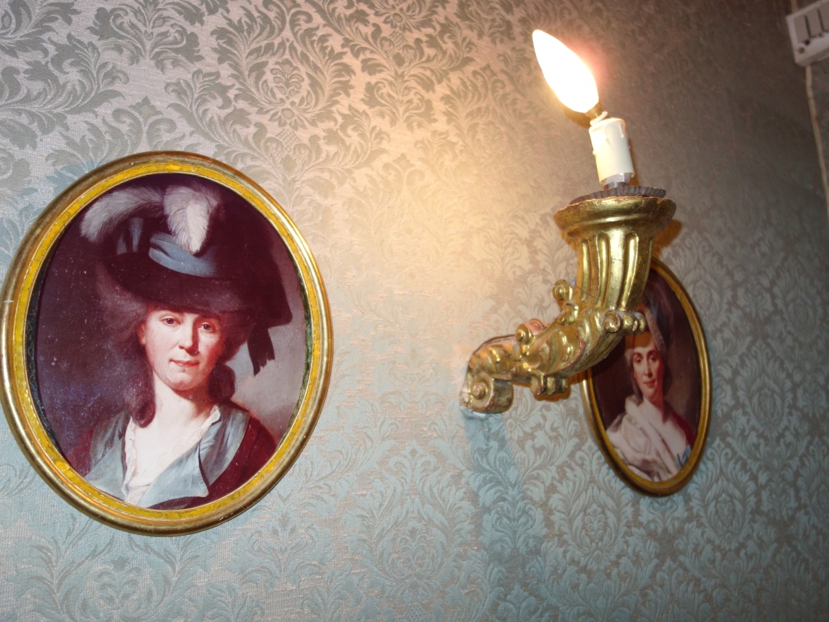 JOINT: Deux CADRES ovales en bois doré ornée de reproductions photographiques (40 x 34 cm) et une CHAISE BASSE CANNEE