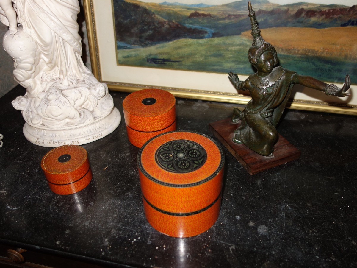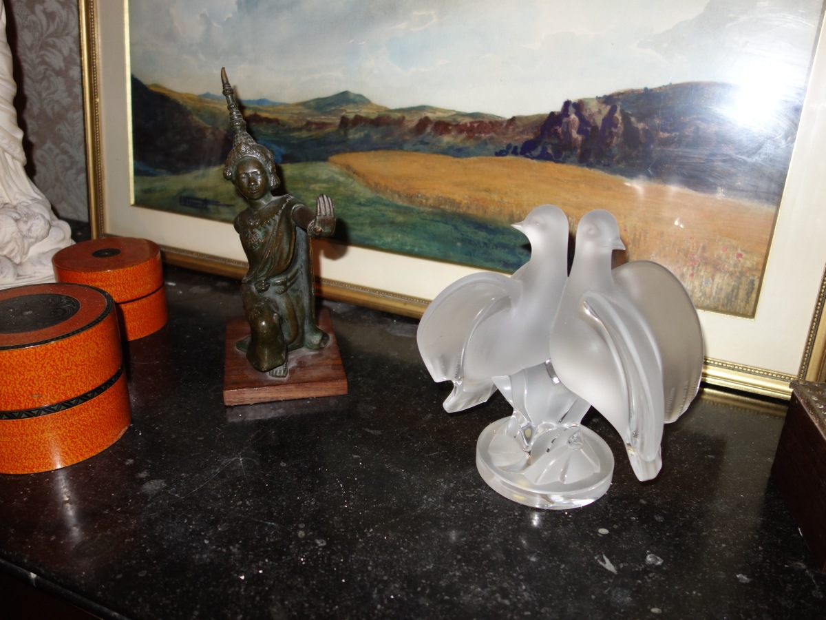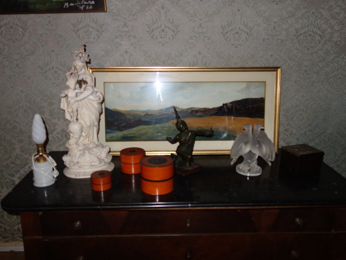 RÉUNION de SOUVENIRS sur la commode: VIERGE de VICTORIES, BRONZE ASIATIQUE. OISEAUX ACCOUPLÉS.