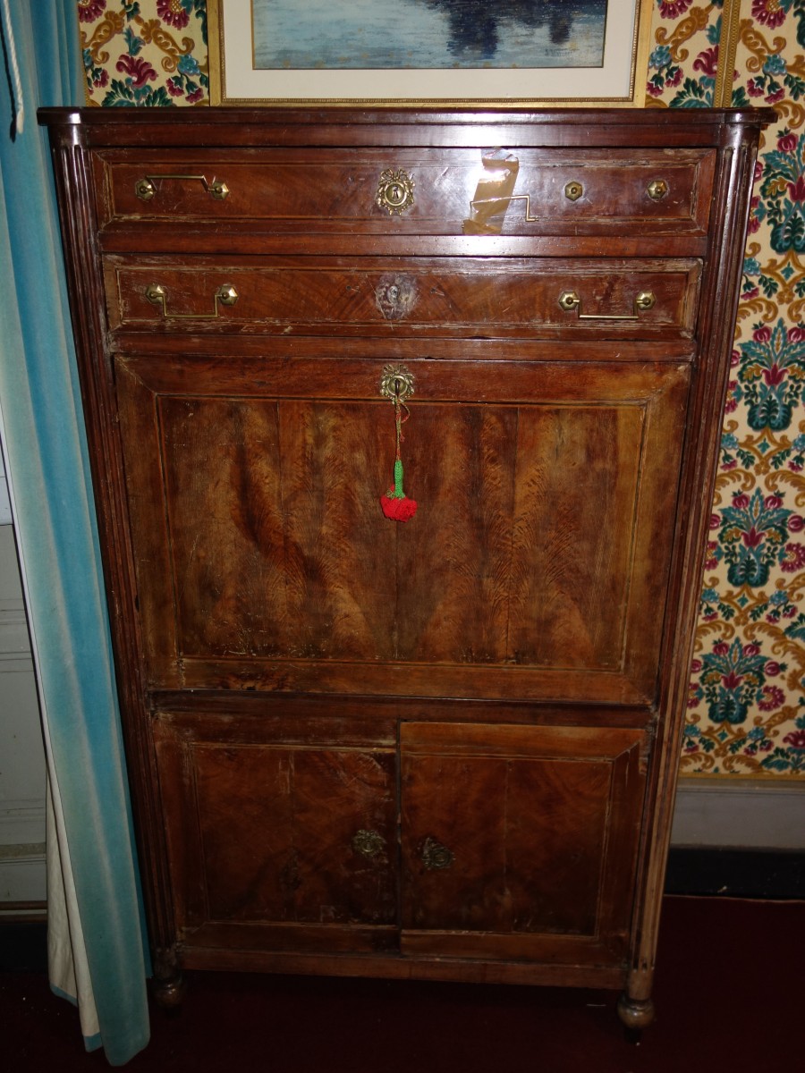 SECRÉTAIRE en acajou ouvrant par deux tiroirs en partie supérieure, un abattant et deux portes en partie basse. Montants à colombes cannelés.