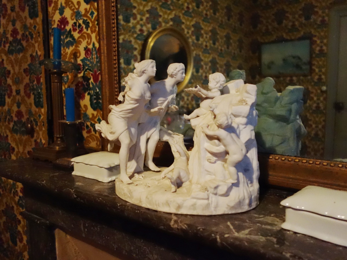 SOUVENIRS SUR LA CHEMINÉE: SUJET EN BISCUIT "La fontaine de l'Amour" (accidents). Haut.: 24 cm, une PAIRE DE BOUGEOIRS, fût à cannelures sur des bases carrées. XIXe siècle. Haut.: 24,5 cm, une paire de PETITS BOUGEOIRS