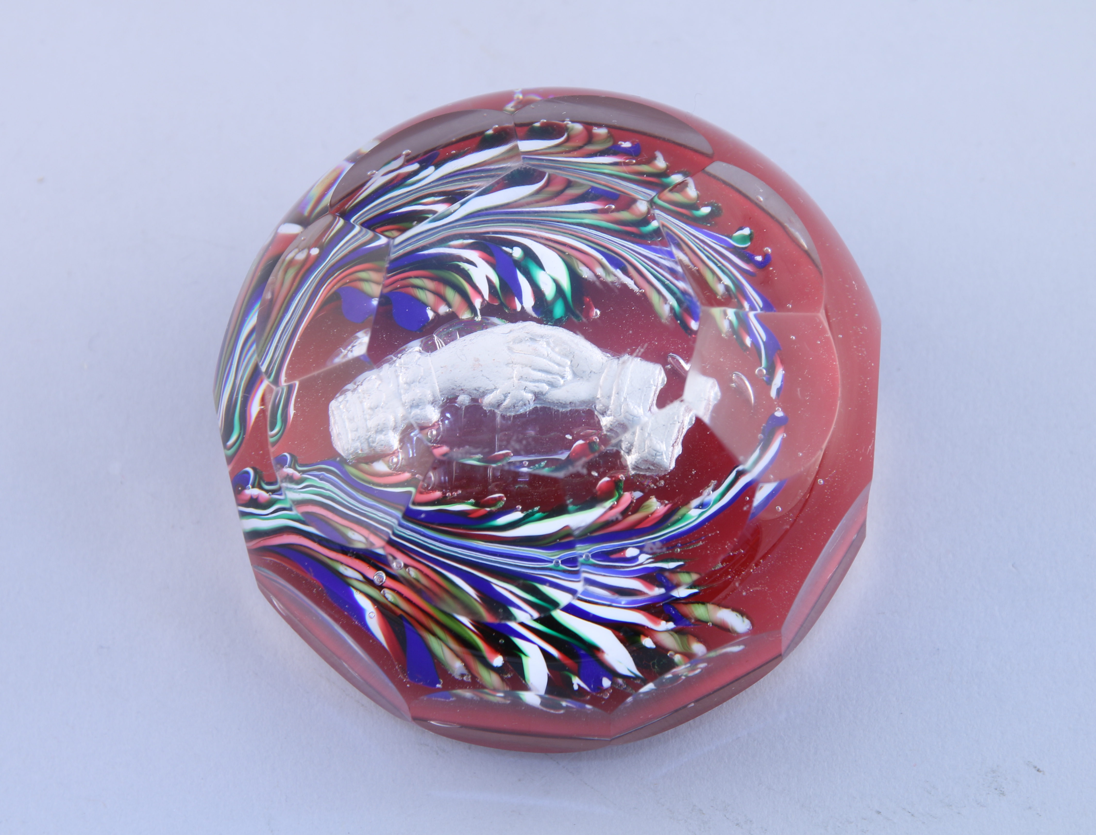 en verre, le fond rouge orné au centre d'un cristallo-cérame représentant la Concorde symbolisée par une poignée de mains, entouré de branches végétales multicolores. Milieu XIXe siècle?