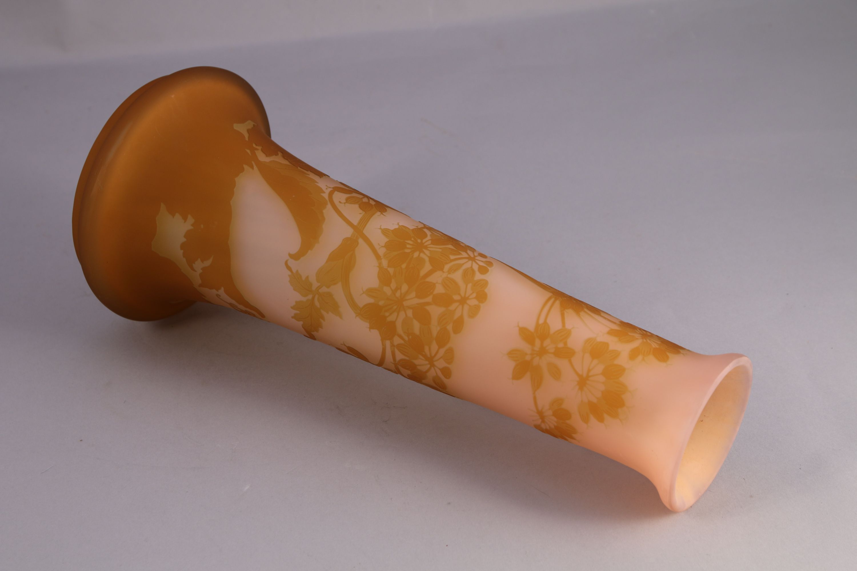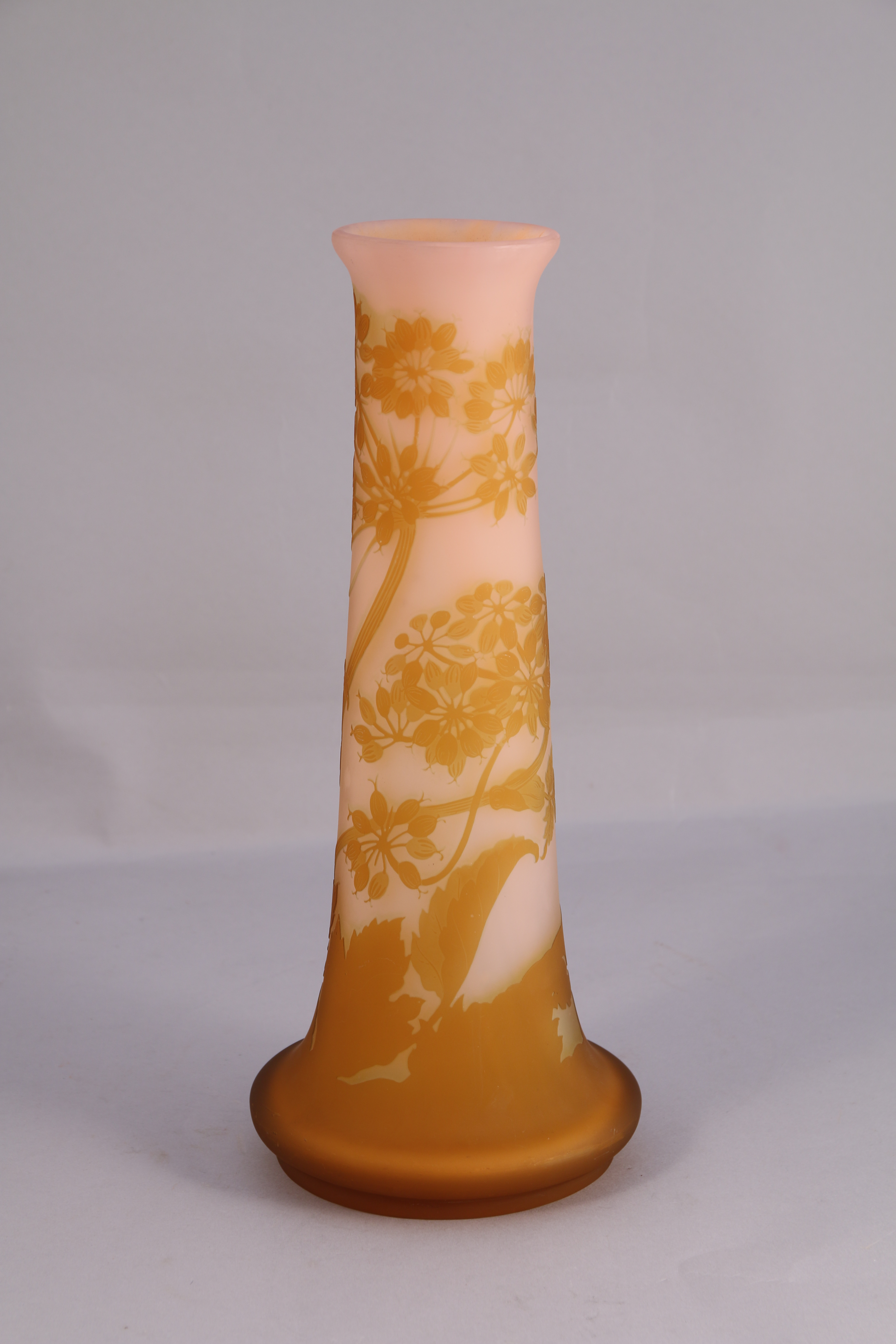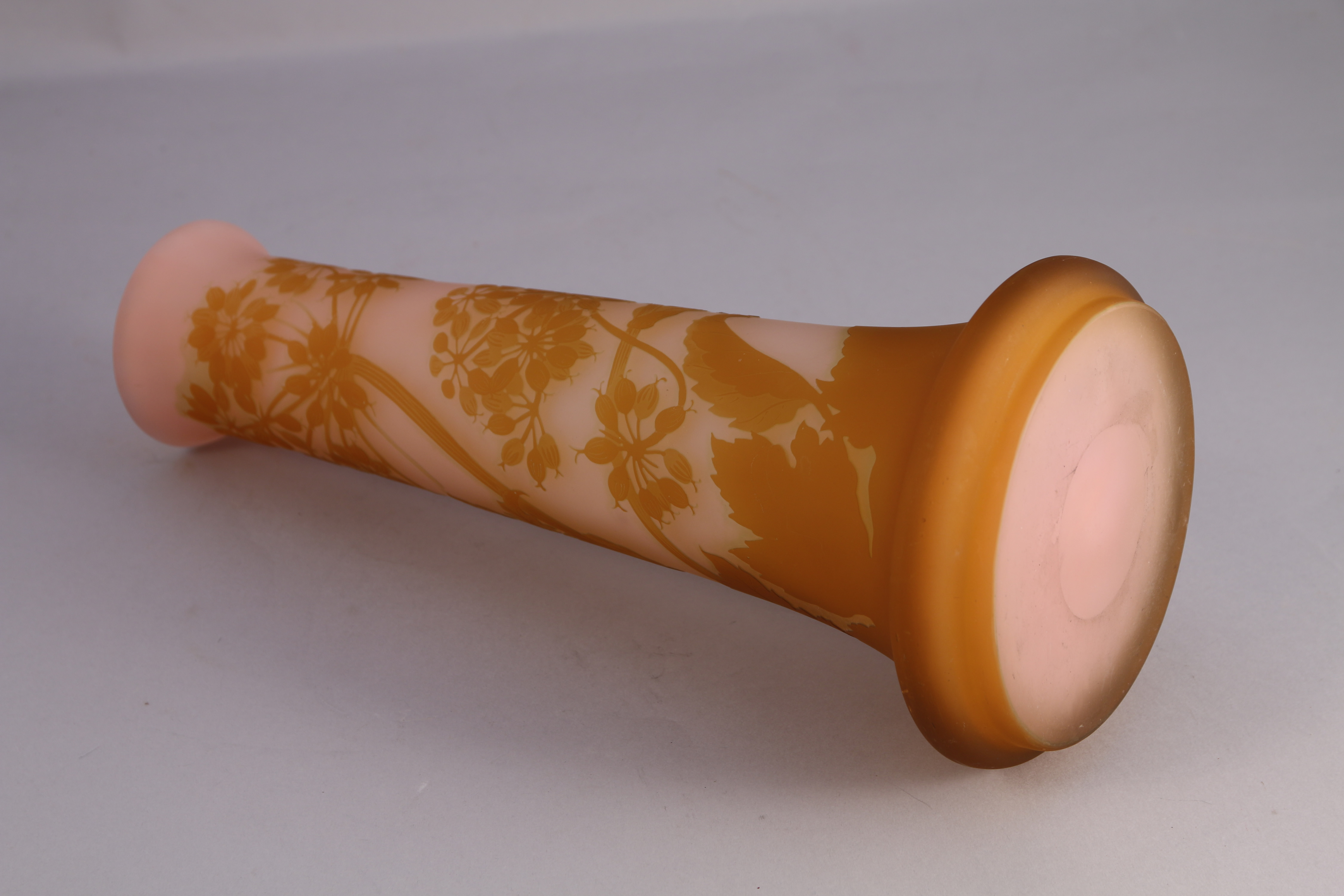 à panse aplatie et col évasé en verre multicouche à décor orangé dégagé à l'acide d'angéliques sur fond rosé.